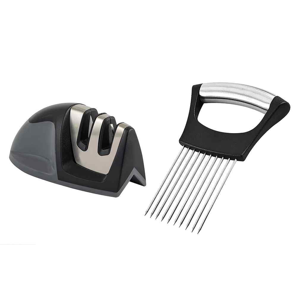 Work smarter in the kitchen with this duo of helpful tools. It includes the Dual Edge Grip Knife Sharpener to improve and hone dull knives, and the Multipurpose Food Slice Assistant to hold meat or vegetables in place while you’re chopping or slicing. Ergonomic and easy to use, these gadgets can help you save time when prepping meals!