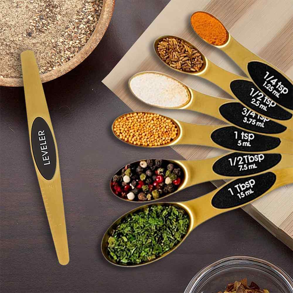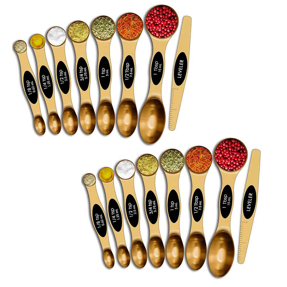 • Two (2) sets of eight (8) Magnetic Dual-Sided Measuring Spoons; sixteen (16) spoons total: