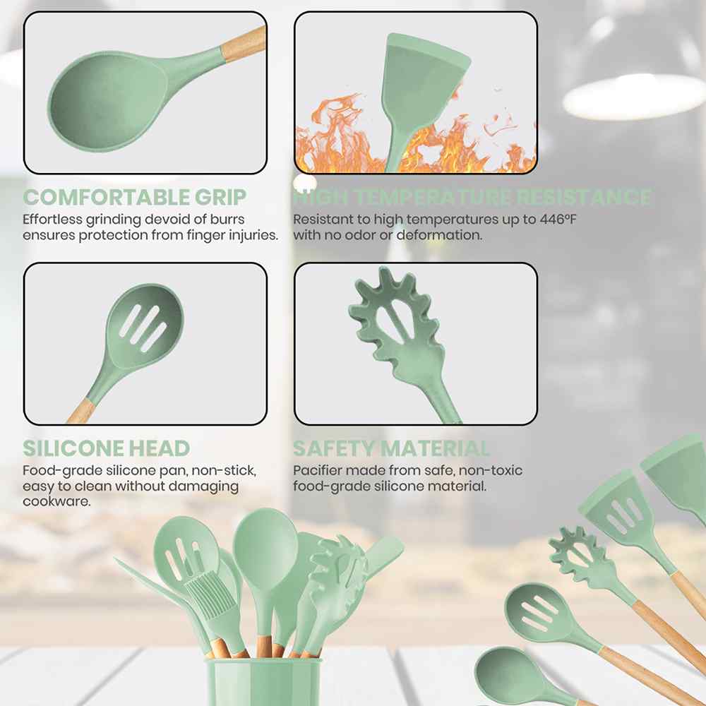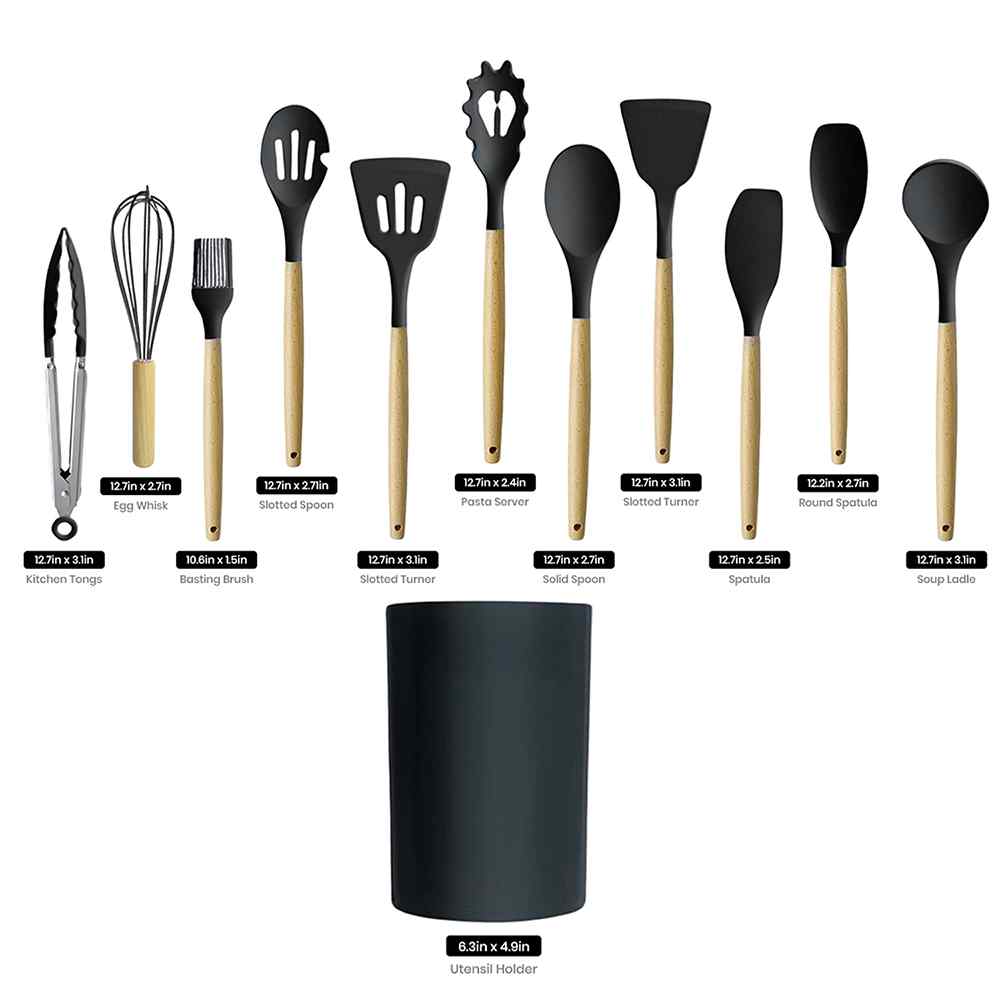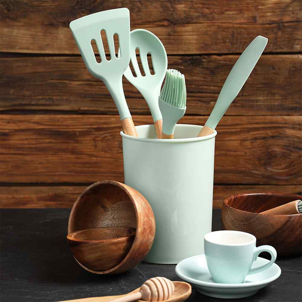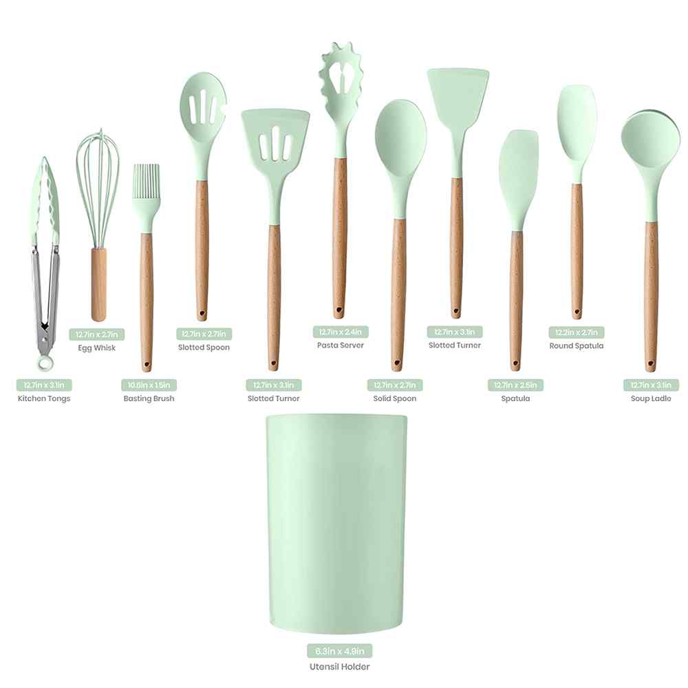 Always have the right tool handy with this complete Silicone Cooking Utensil Set. Crafted from heat-resistant silicone with wooden handles, this beautiful utensil set is sure to elevate your cooking experience and look great while doing so.