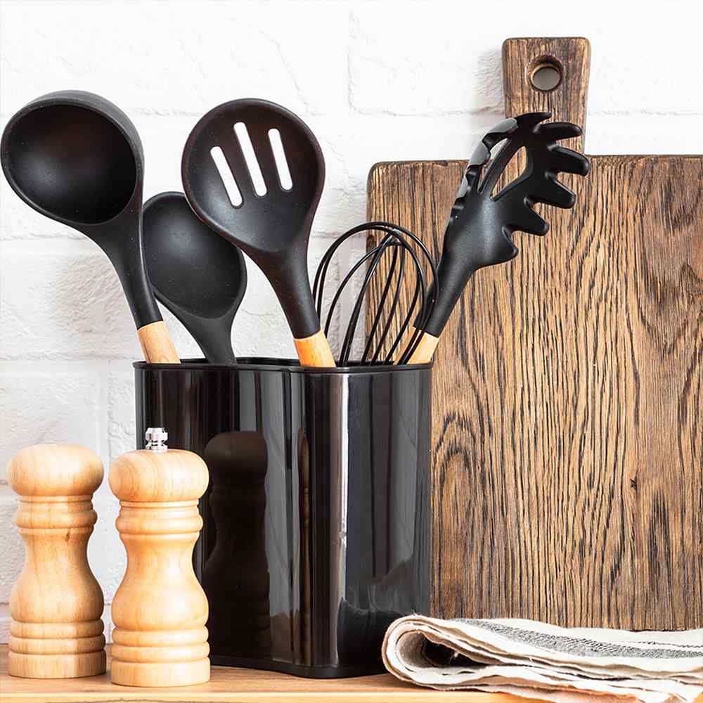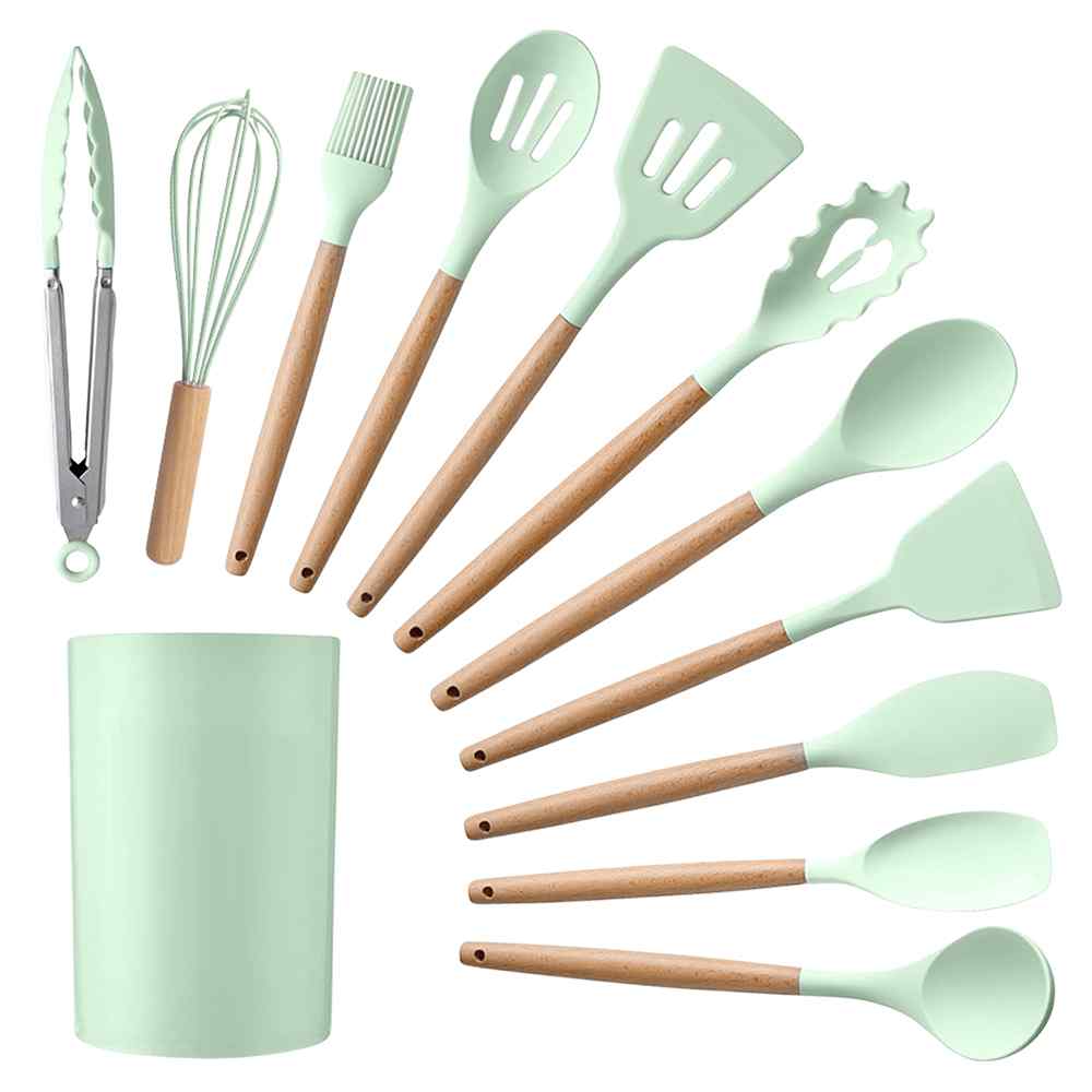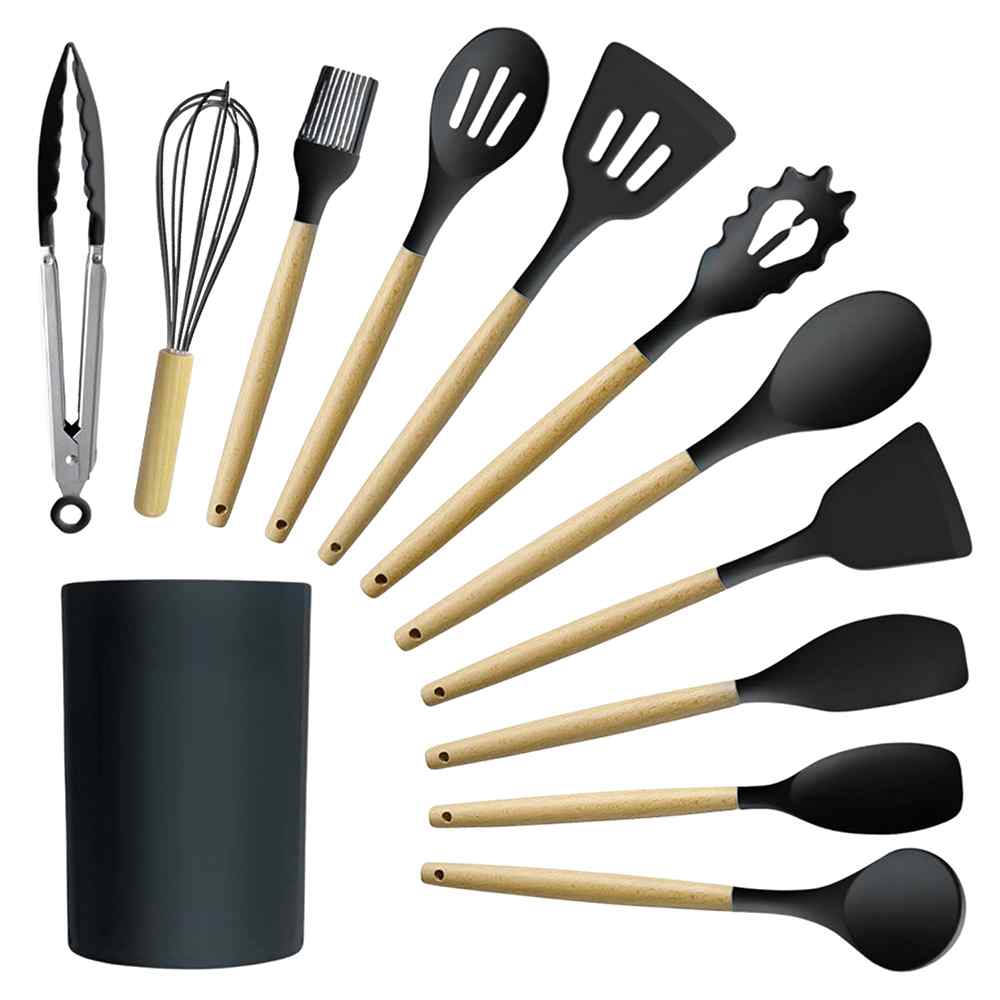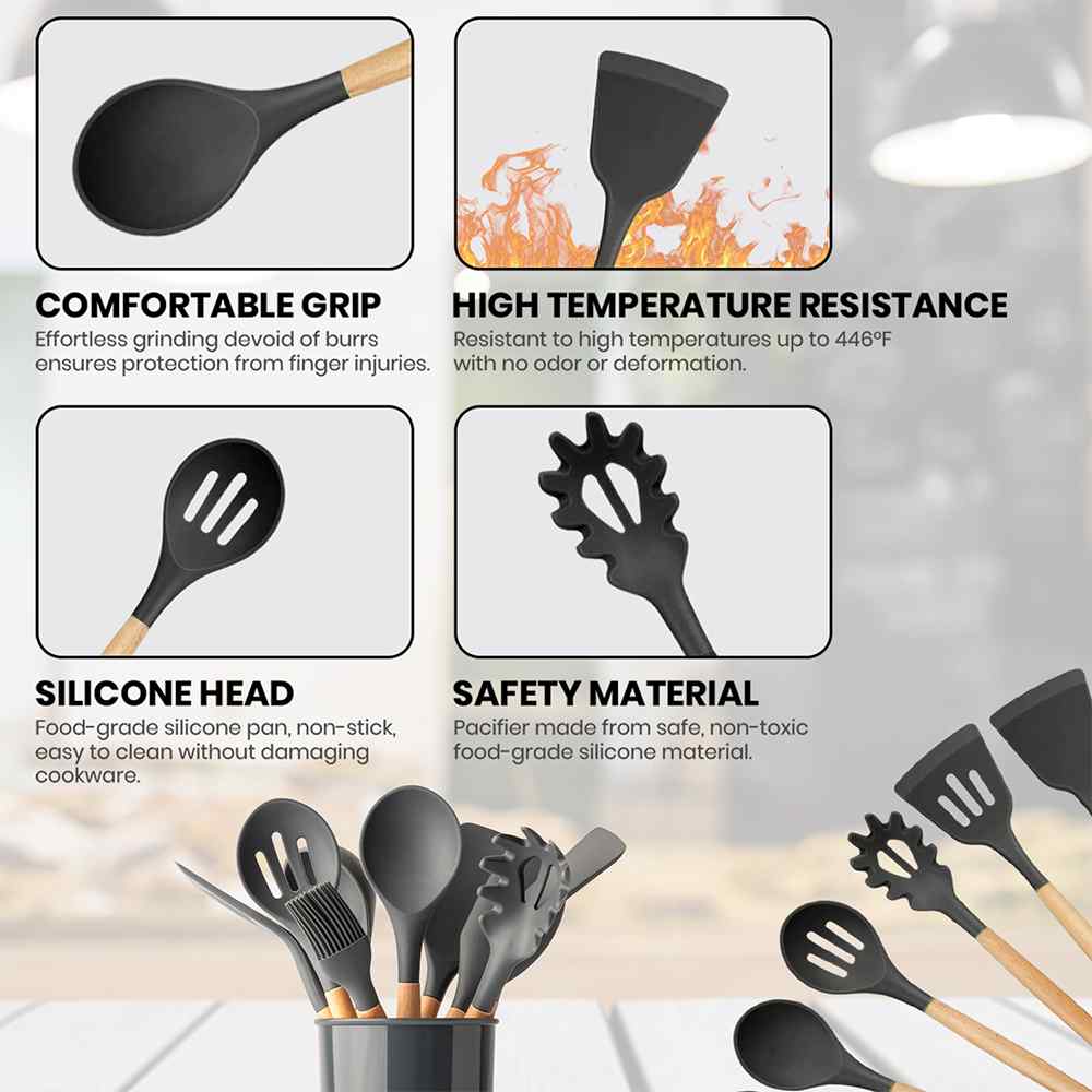 Always have the right tool handy with this complete Silicone Cooking Utensil Set. Crafted from heat-resistant silicone with wooden handles, this beautiful utensil set is sure to elevate your cooking experience and look great while doing so.