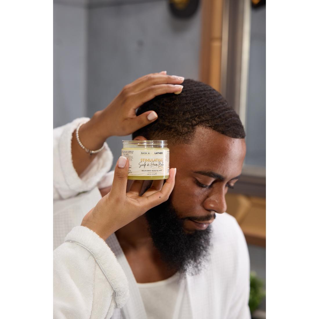 • After applying the Scalp Stimulator, use a small amount of the Stimulating Scalp & Hair Balm on your scalp and hair, focusing on areas that need extra moisture or care