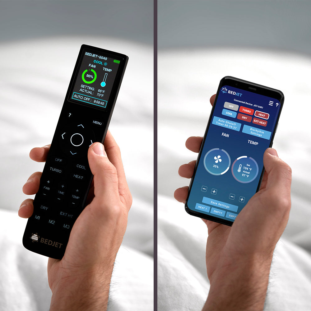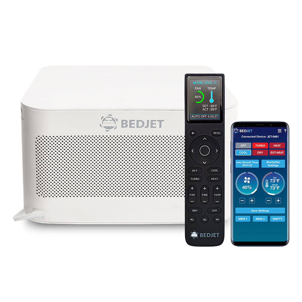Meet the BedJet 3—designed for better sleep with powerful and quiet on-demand cooling, warming, and sweat-drying climate comfort right in your bed! BedJet sends a gentle and quiet stream of air directly into your bed where it is most efficient and effective to keep you comfortable while you sleep. With an advanced remote control and integrated biorhythm sleep technology to enable custom temperature and fan settings for every hour of the night, BedJet can help you fall asleep faster, stay asleep longer, and wake up more refreshed.