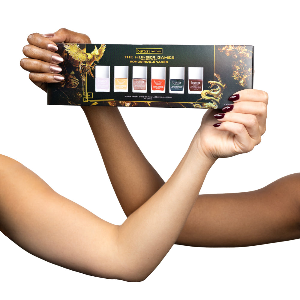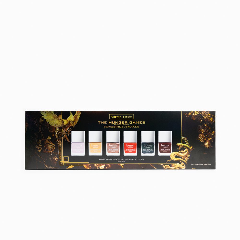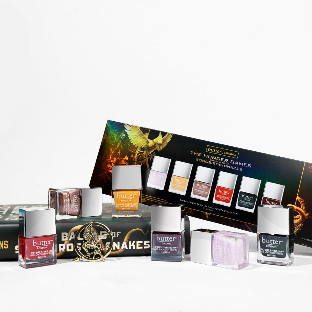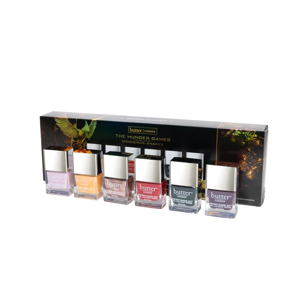 May the odds forever be in your favor with six mini Patent Shine 10X Nail Lacquer hues—all inspired by the long-awaited Hunger Games movie prequel! Explore a soft lavender crème, dark blackberry, bubbly rose, royal emerald, pop orange, and smashing! siren red crème that’s truly epic.