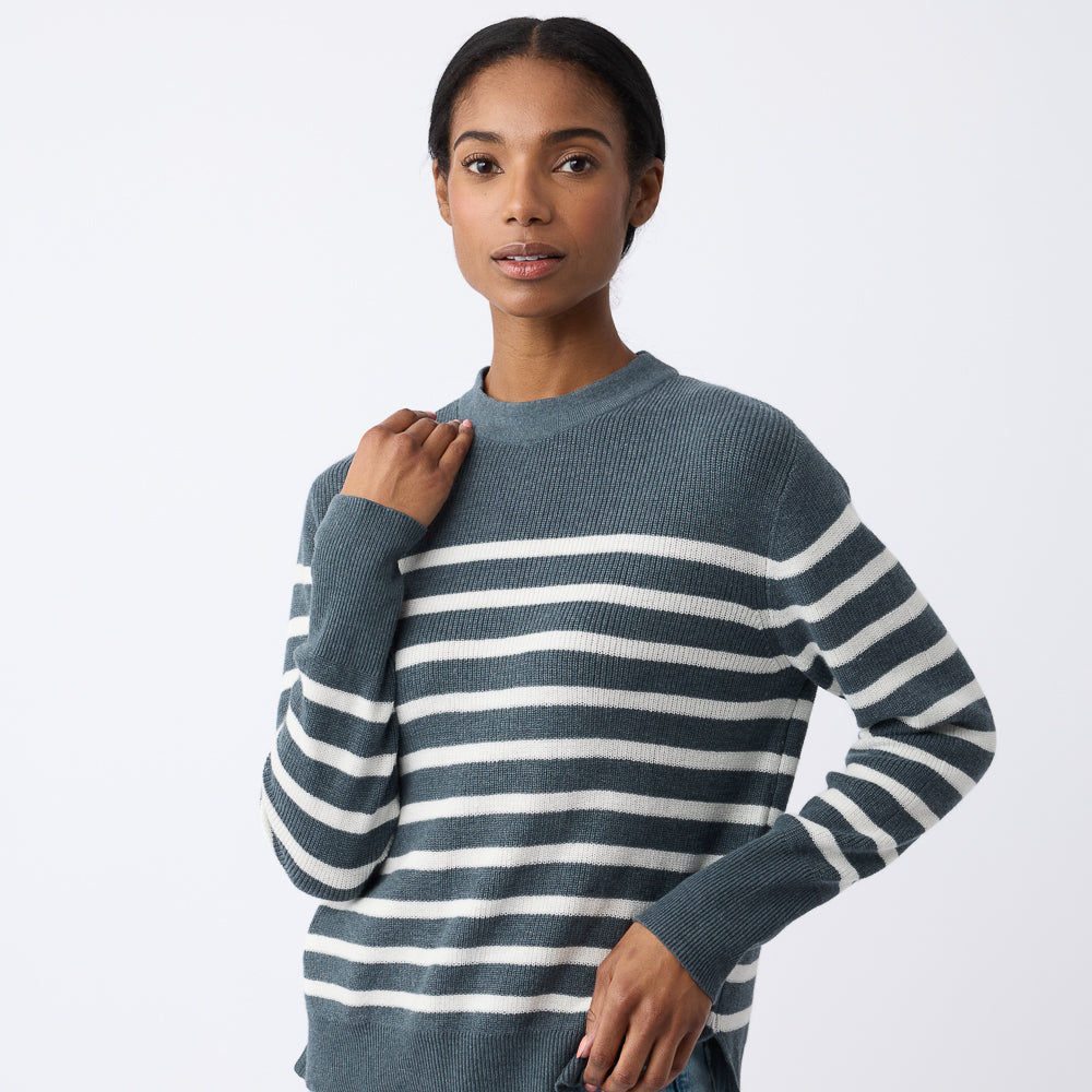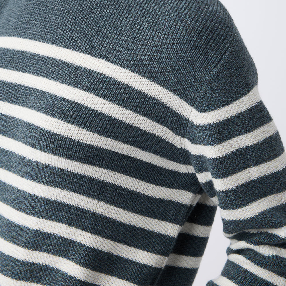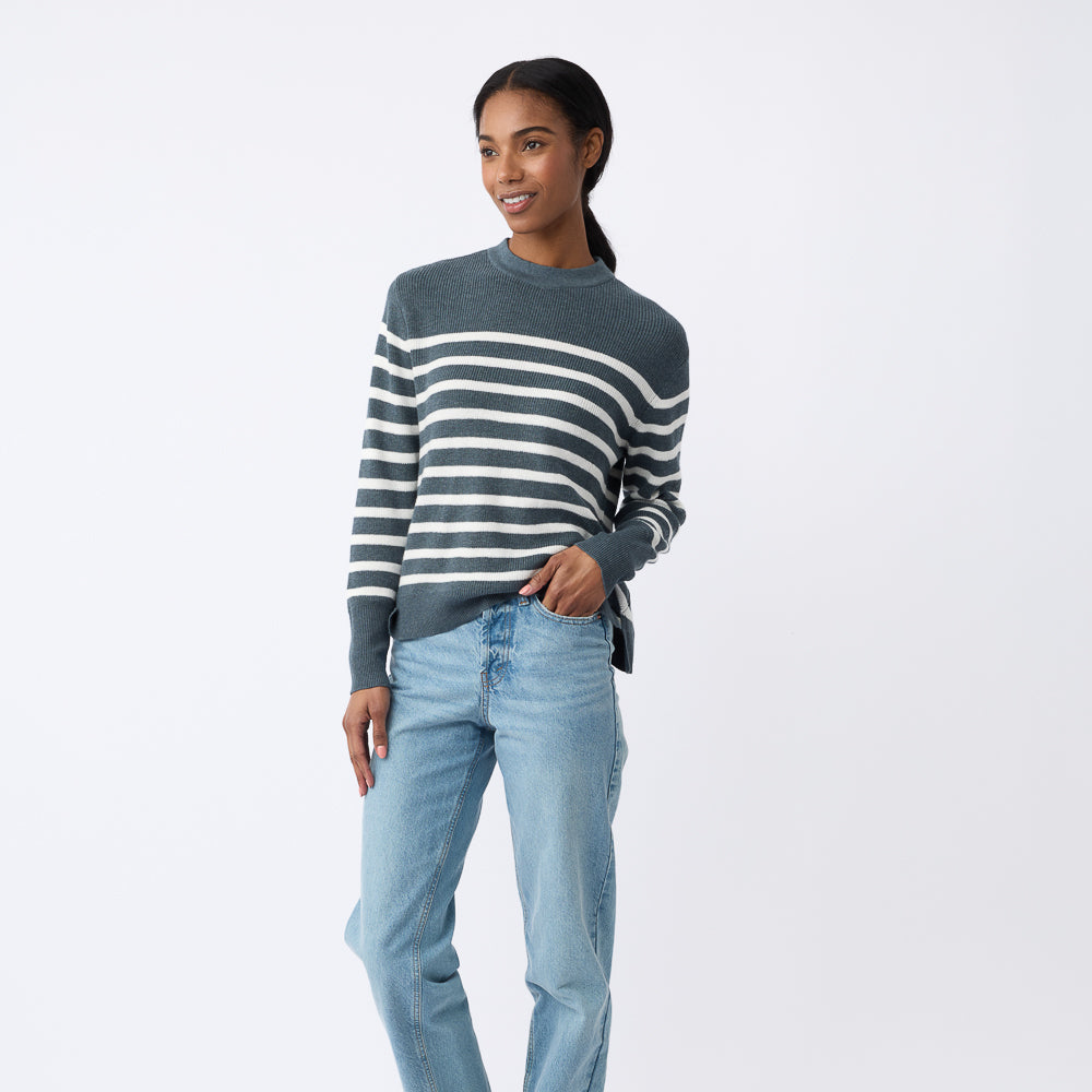 The Rowan Sweater is your ultimate choice for an elevated casual look. Made from a luxurious cotton blend, this lightweight knit offers an ideal balance of breathability and warmth. With a crew neckline, extended ribbed cuffs, and stylish side vents, it prioritizes both comfort and sophistication. The playful striped pattern adds a touch of fun to its versatile silhouette, making it great for layering or wearing alone.