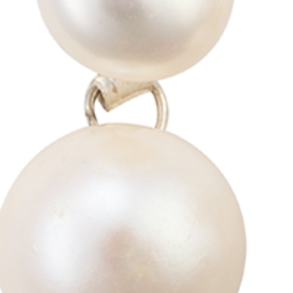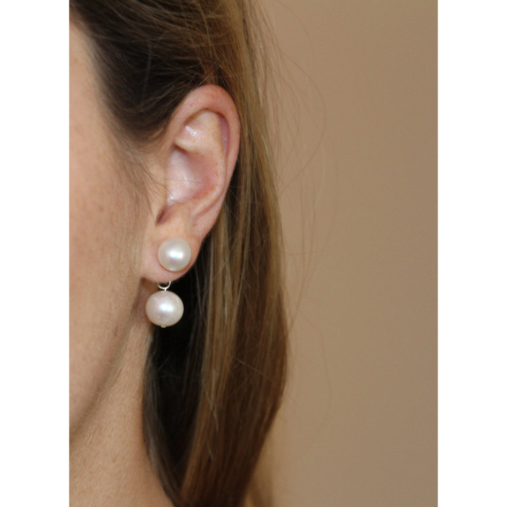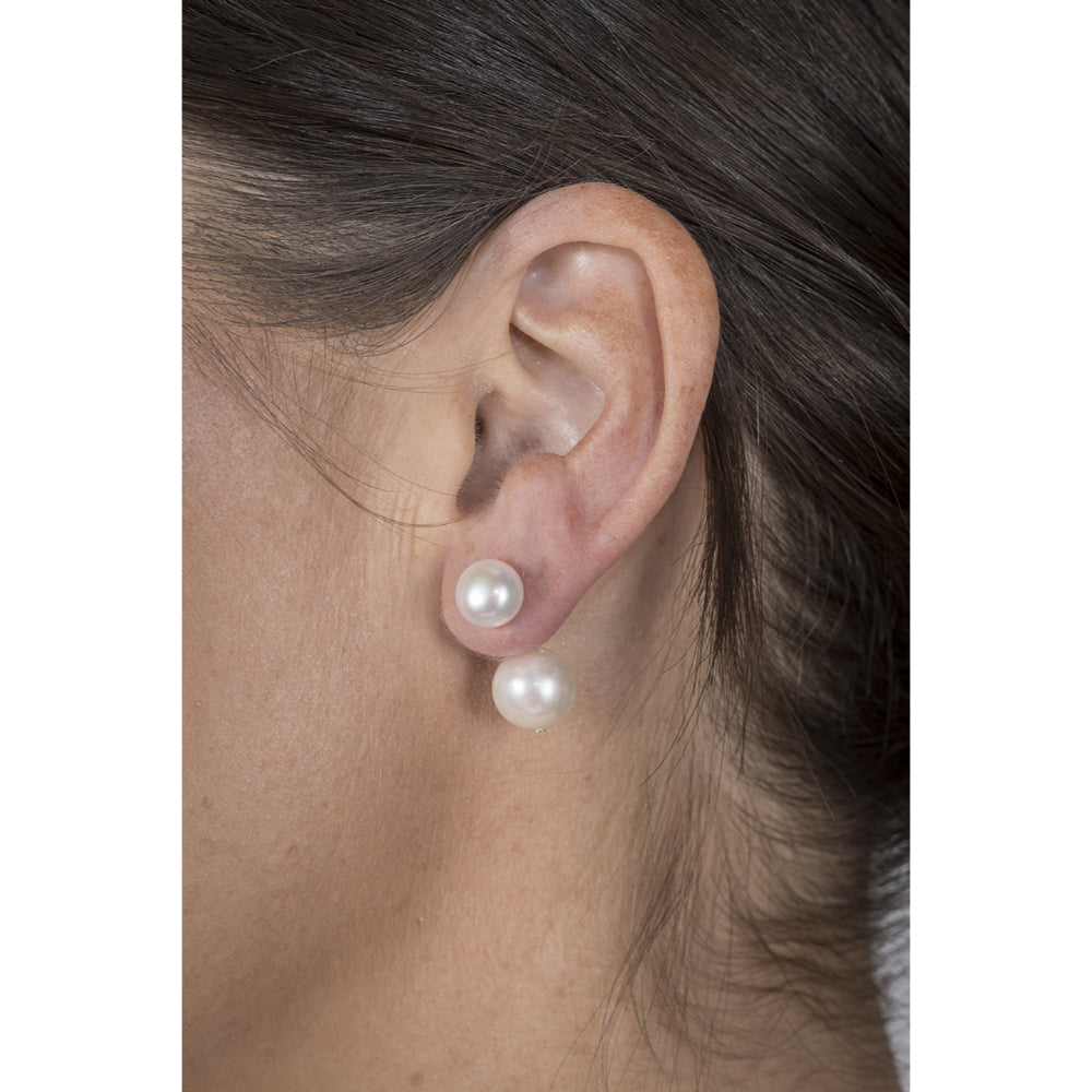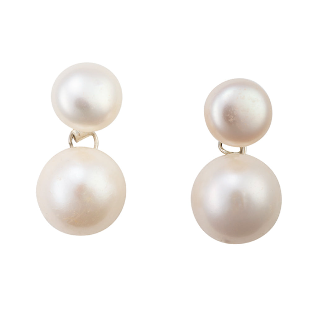 These classic double pearl studs can be worn together or separately as single studs. The larger pearl hangs freely below the smaller pearl.