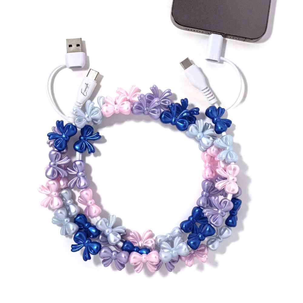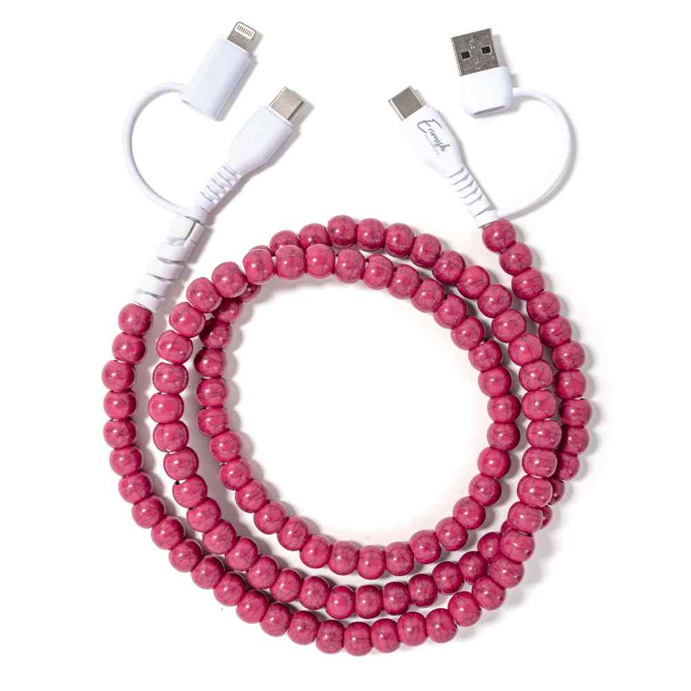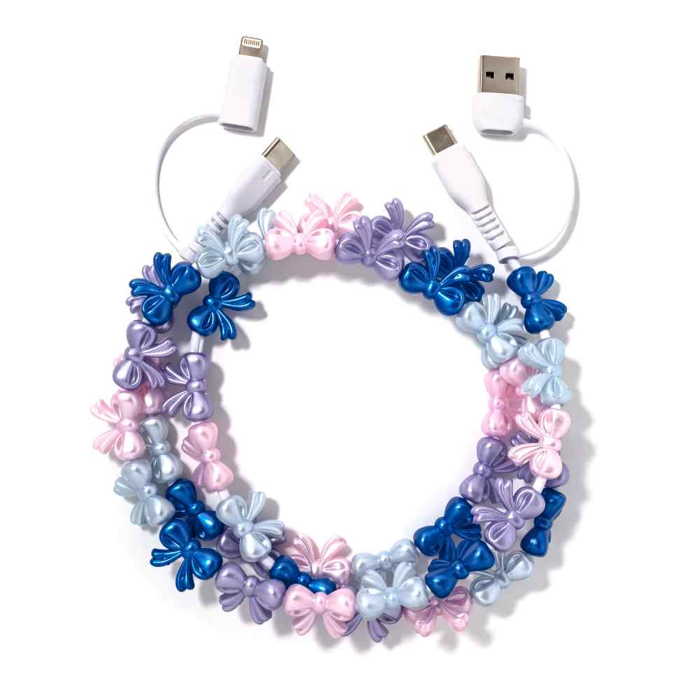 Charge your phone in style with a beaded charging cable. This 2-in-1 USB cable for Type A, Type C, and Lightning devices is not just pretty—it’s powerful! It features 60W fast charging and quick data transfer. Available in two lengths for versatility.