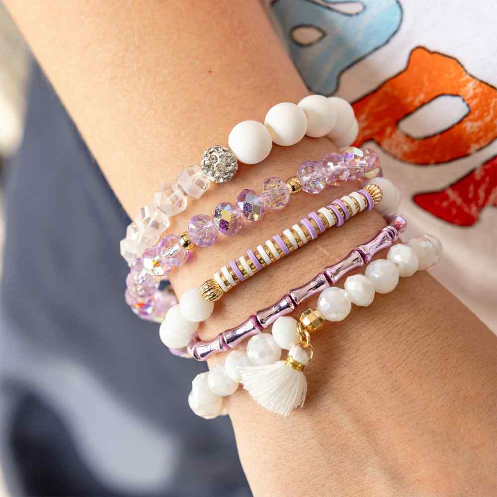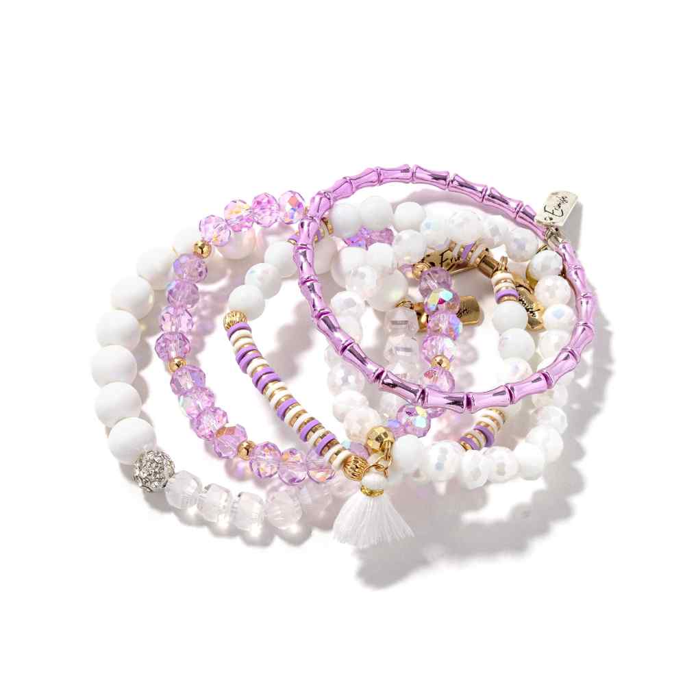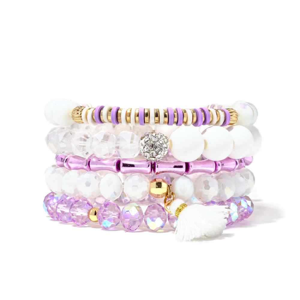 • Violet: This bracelet stack features soft shades of purple and an array of sparkly beads