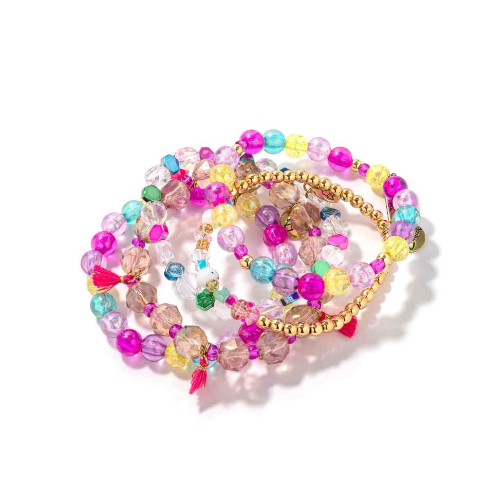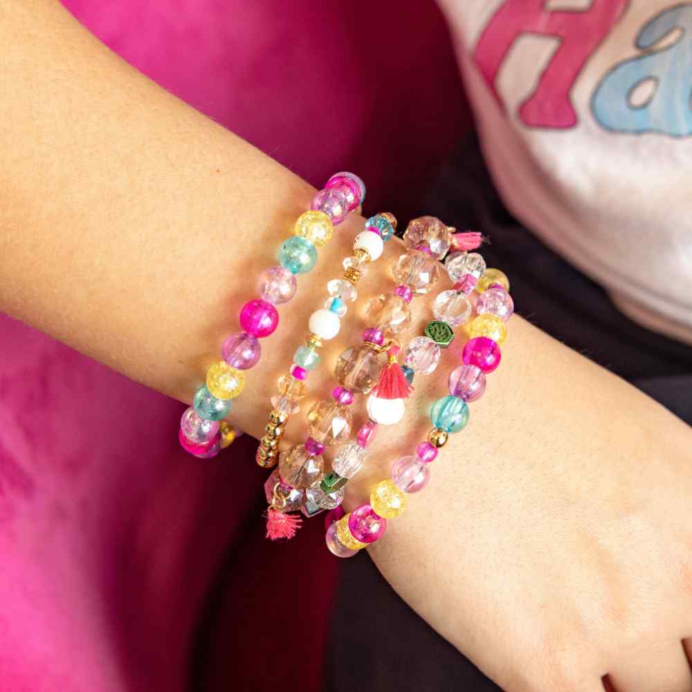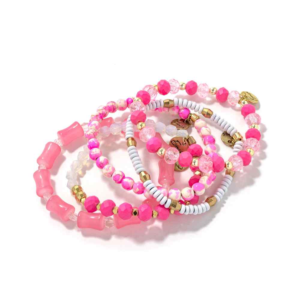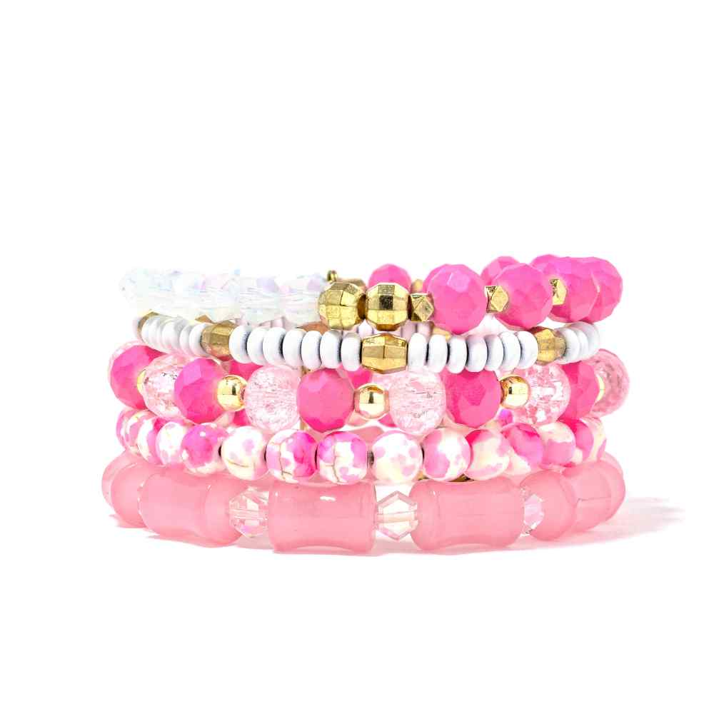 • Bubblegum: Sweet, bold, and unapologetically fun—this bubblegum pink bracelet stack is pure joy on your wrist. Bright and cheerful hues layer together for maximum impact and endless styling possibilities