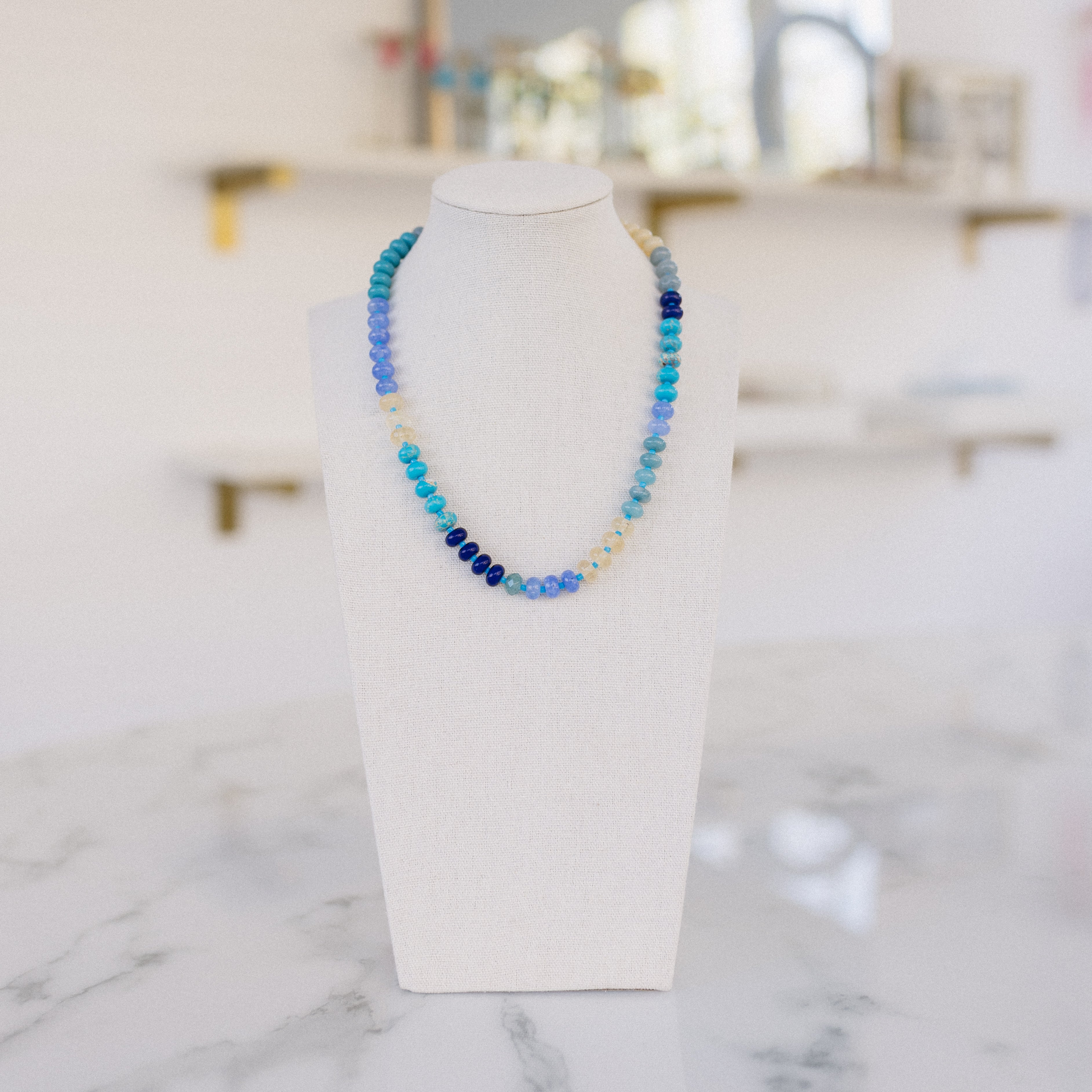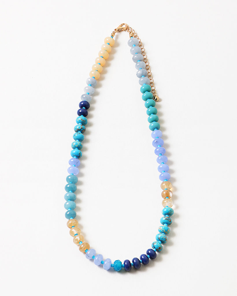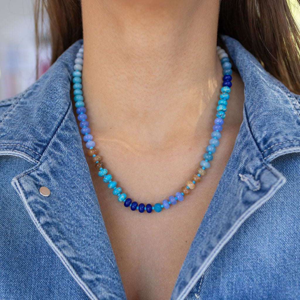 Named “Beautiful Moon,” this necklace captures the stunning colors of the moon’s many phases. Shades of blue mingle with warm tones of caramel toffee, cream, and peach, reminiscent of a blue moon, pink moon, orange moon, and yellow moon. Ethereal and luminous, this necklace feels like a little piece of the night sky brought to life.
