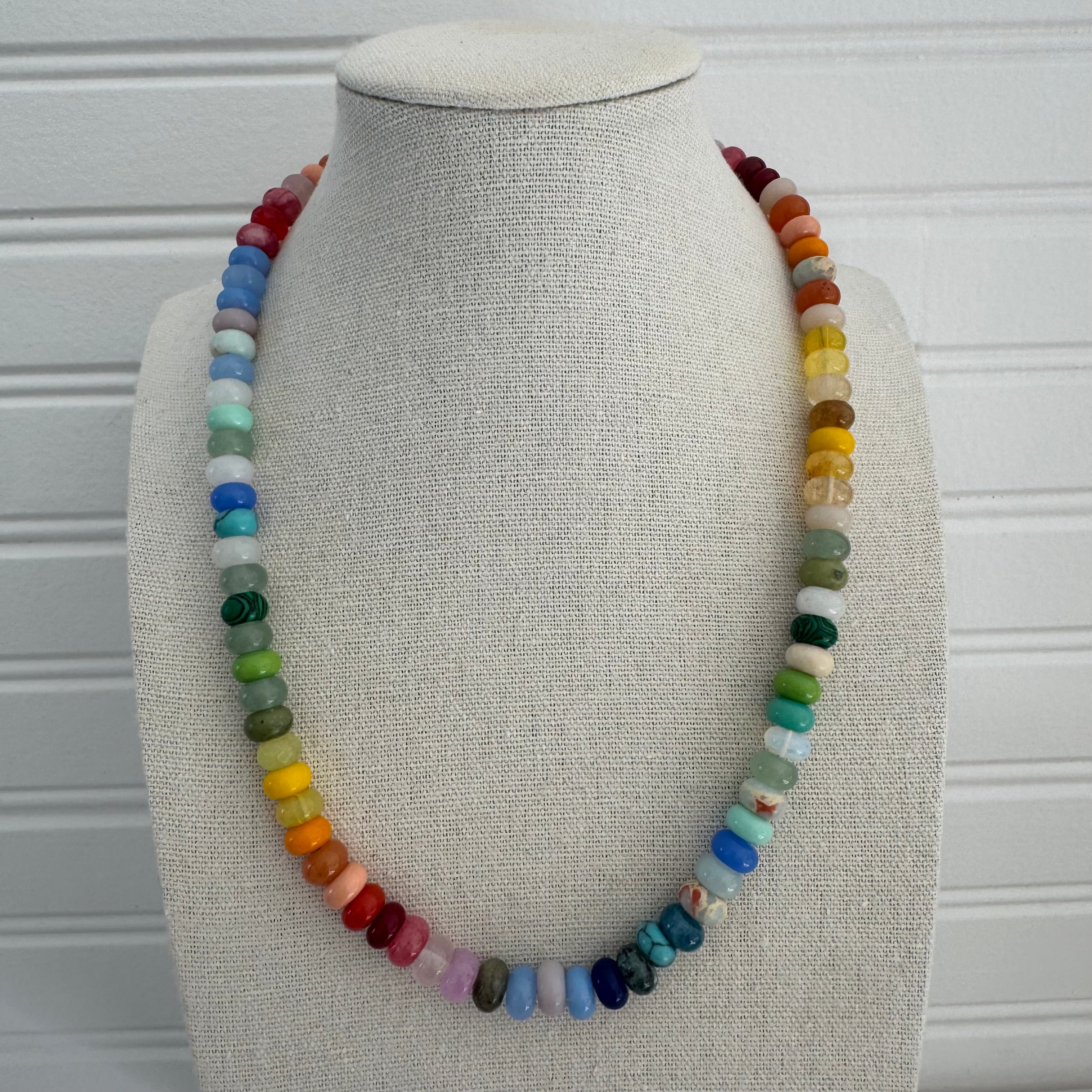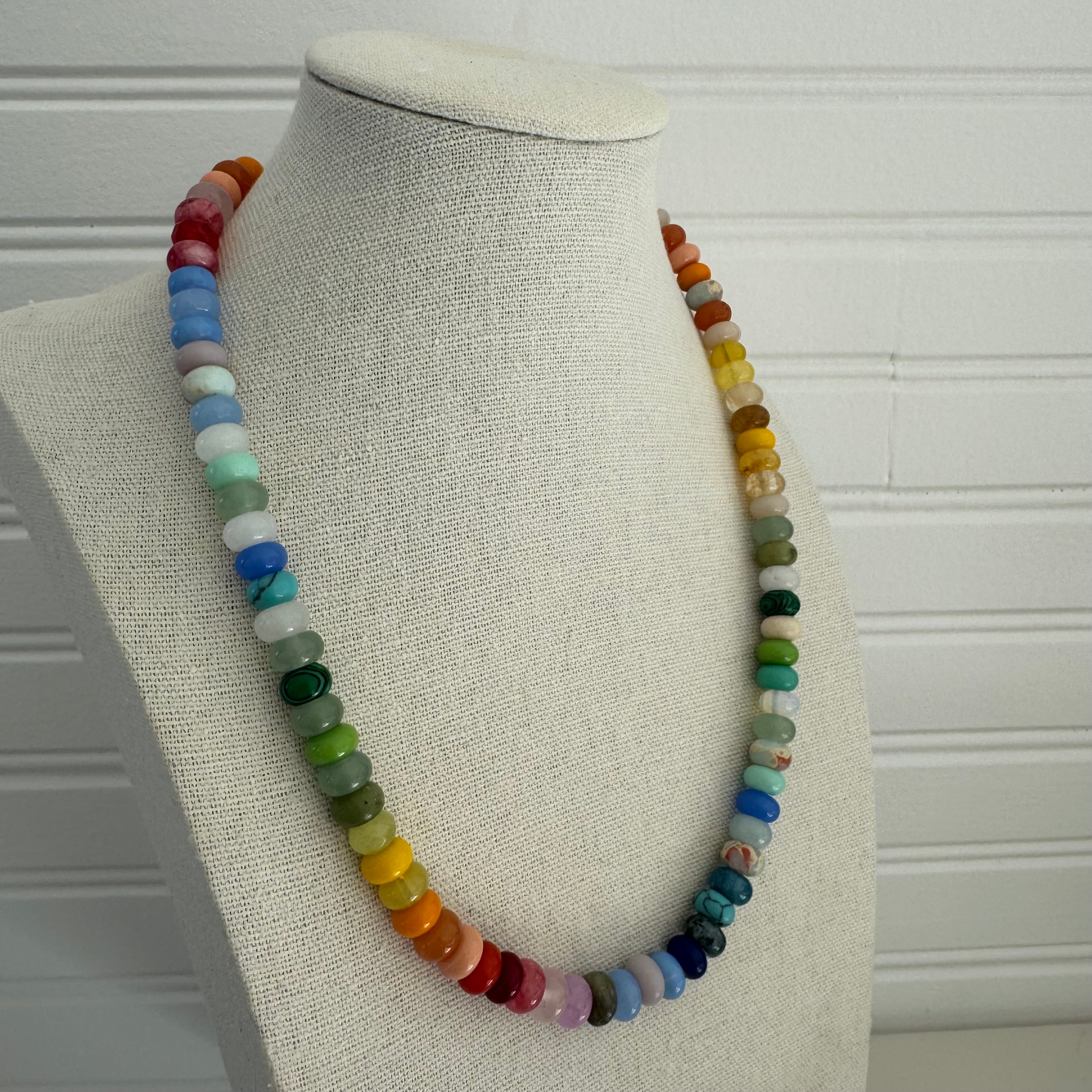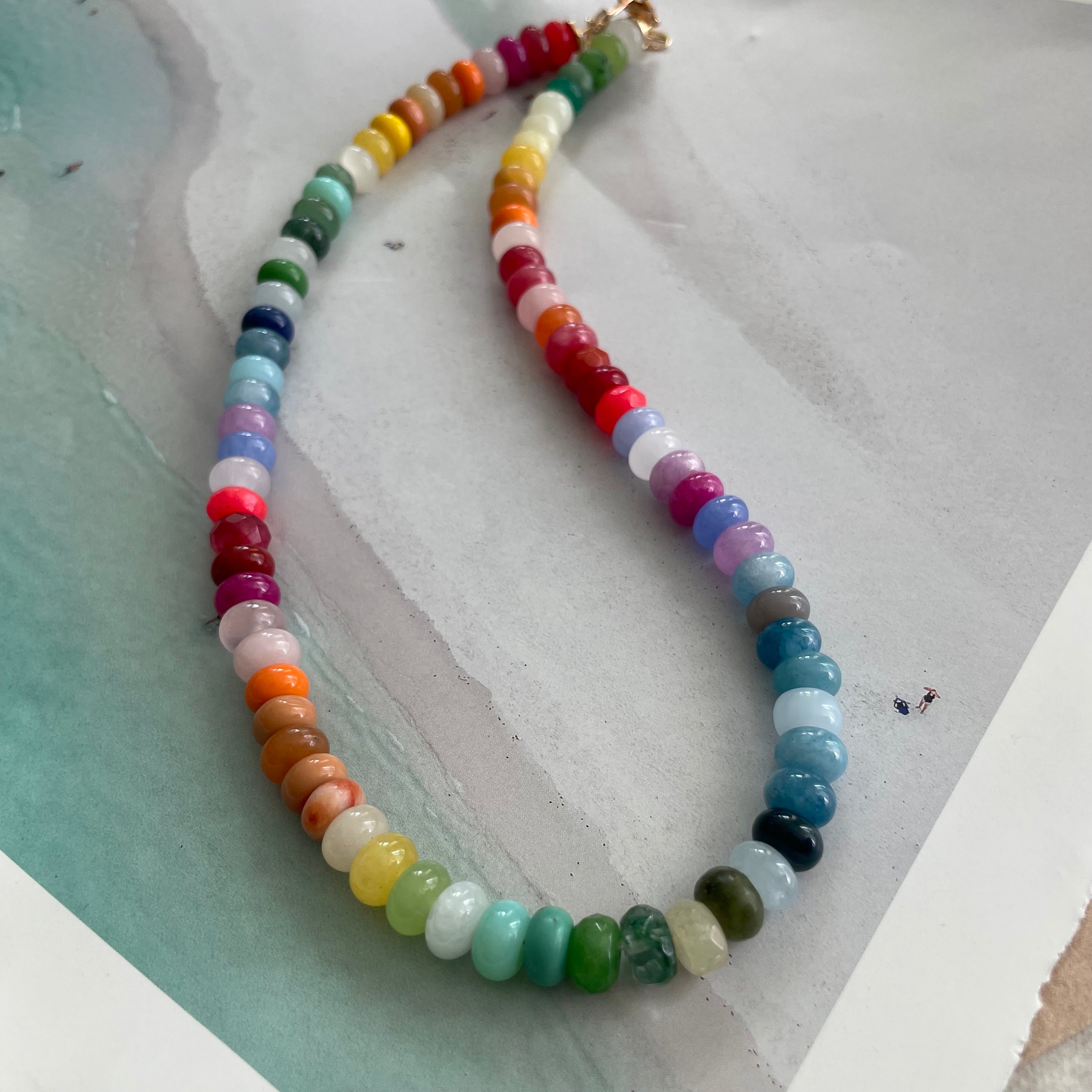This necklace is a true conversation accessory—reminding us to keep going until we reach the gold at the end of the rainbow! The colorful gemstones create a vibrant circle around your neck and connect with a gold-plated clasp and extender.