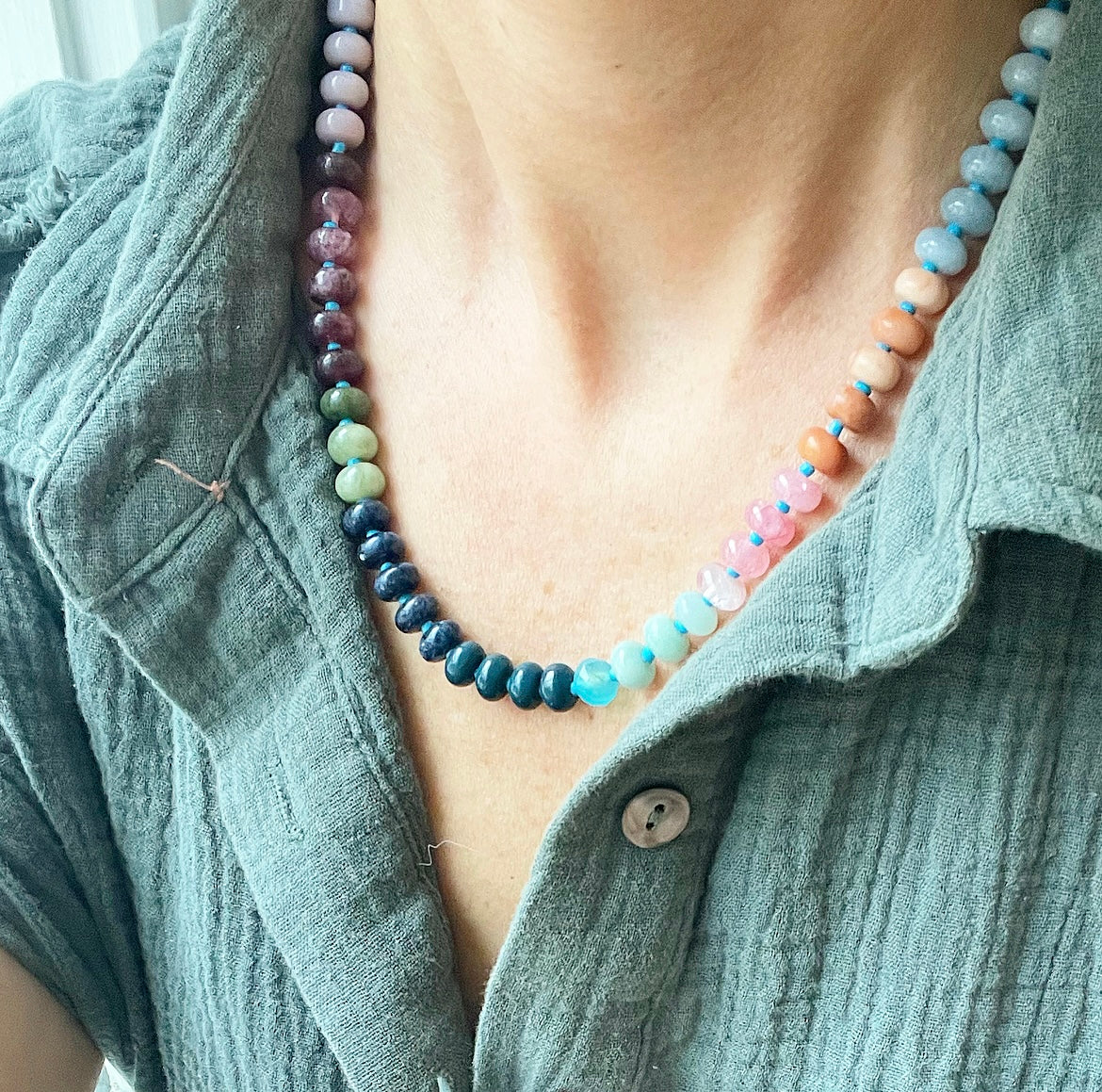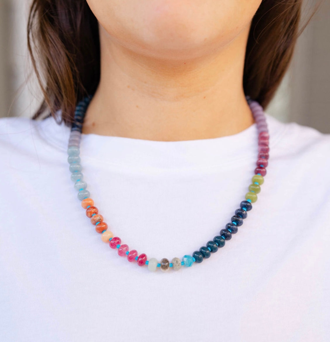 This vibrant gemstone necklace features a stunning array of colors, blending deep blues and purples with bold splashes of red, orange, and green. The smooth, polished semi-precious stones are thoughtfully arranged to create a lively and eye-catching design, ideal for adding a pop of color to any look.