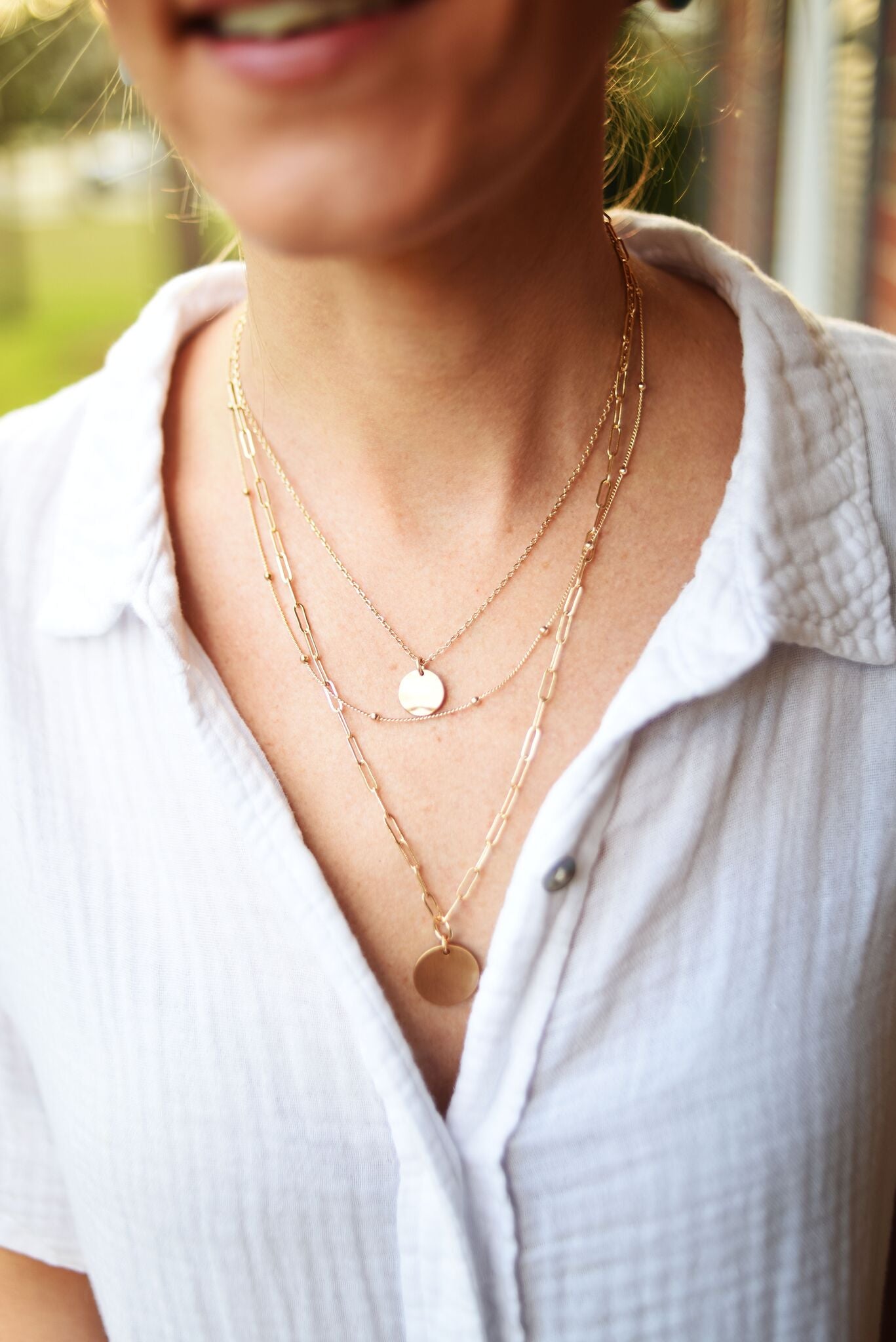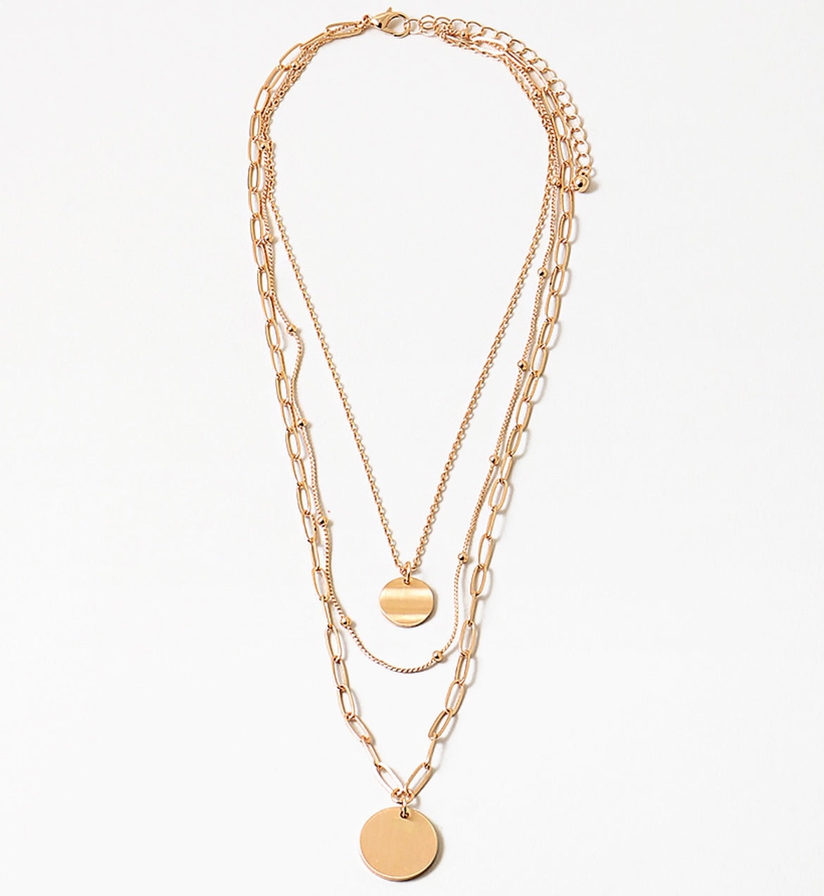 This eye-catching multilayer necklace features three vibrant gold chains in various lengths with delicate beads and disc pendants. Its classic design adds a timeless touch to any blouse, tee, or dress.