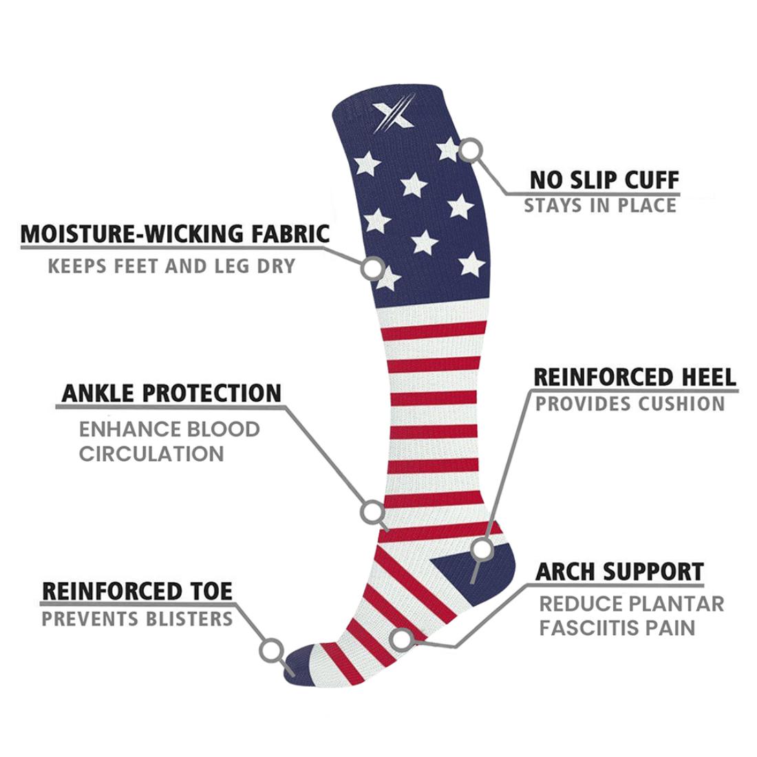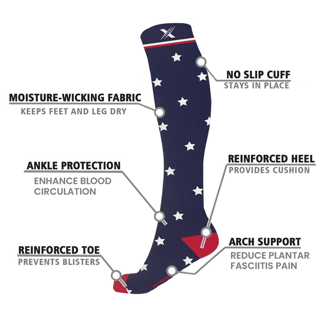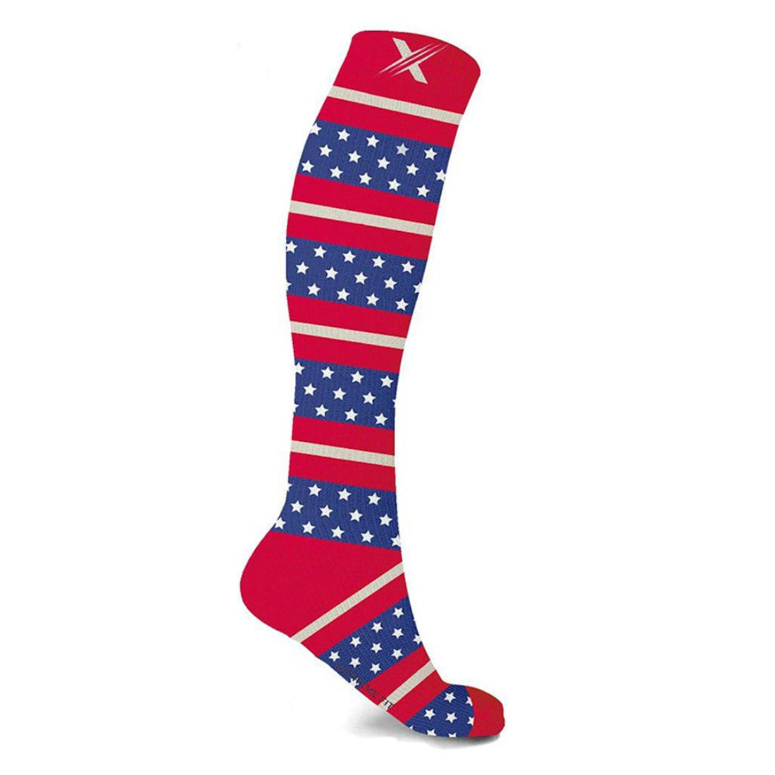 Step into patriotic pride and comfort with these quality knee-high compression socks. Designed to improve circulation, reduce swelling, and relieve aches and fatigue, these socks are ideal for running, cycling, travel, pregnancy, and more.