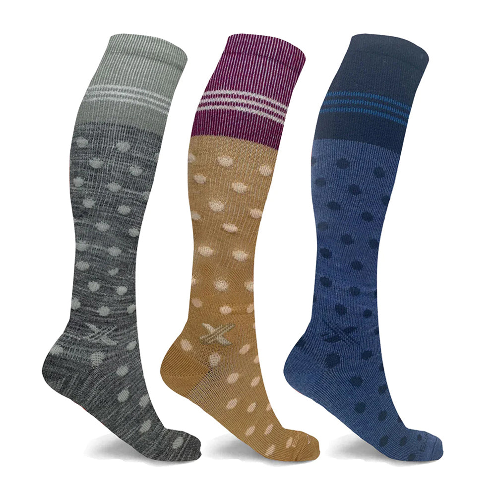 Includes three (3) pairs of Polka Dot Merino Wool Knee-High Compression Boot Socks in size of your choice