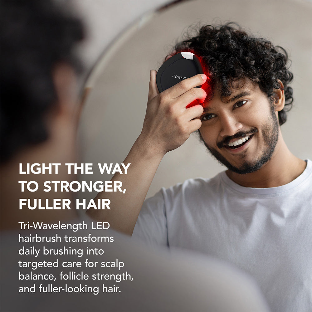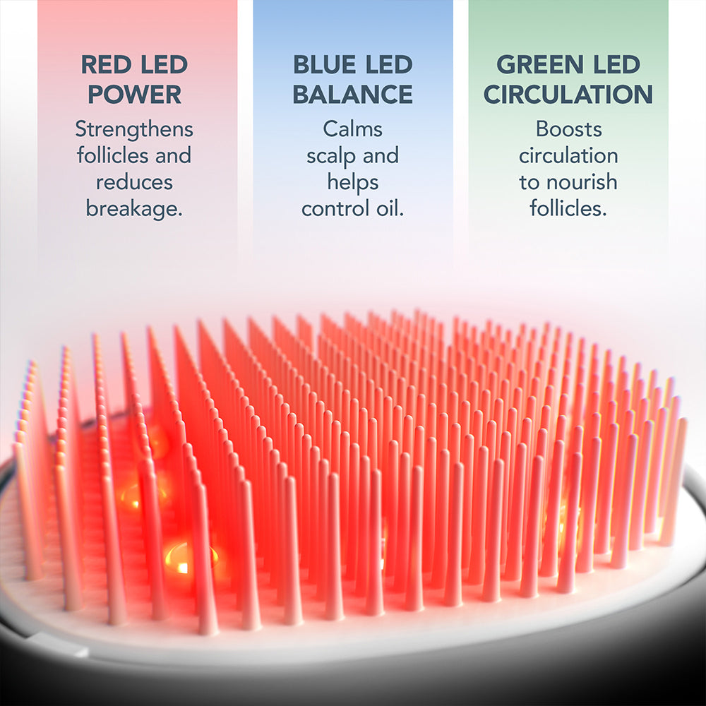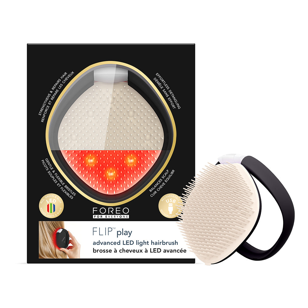 The FLIP™ Play Advanced is a 3-in-1 LED hairbrush designed to detangle, smooth, and revive hair and scalp health in one effortless stroke. Its ultra-flexible bristles glide through knots without tugging, while red, blue, and green LED lights deliver targeted care to help strengthen strands, balance the scalp, and support fuller growth. Powered by clinical-grade light technology, each LED wavelength penetrates the scalp to energize follicles, regulate oil, and boost circulation—creating the ideal foundation for healthy hair.