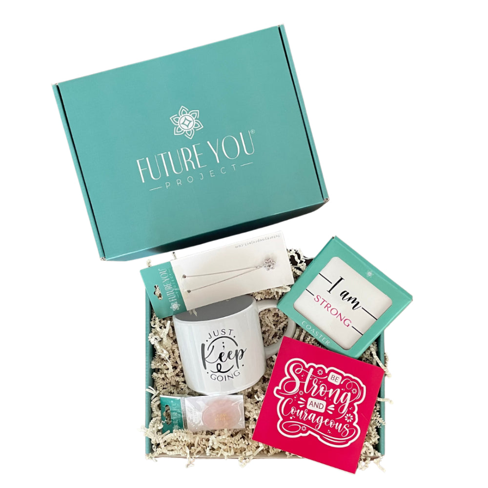 The Stay Strong Gift Box includes five inspirational gifts, along with a personalized letter from the recipient's future self, reminding them that they are never alone and brighter days are ahead.