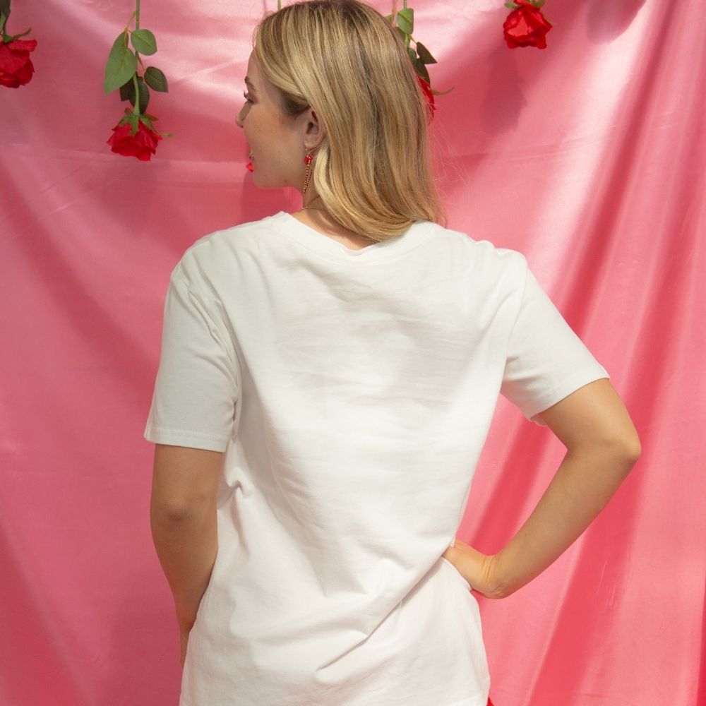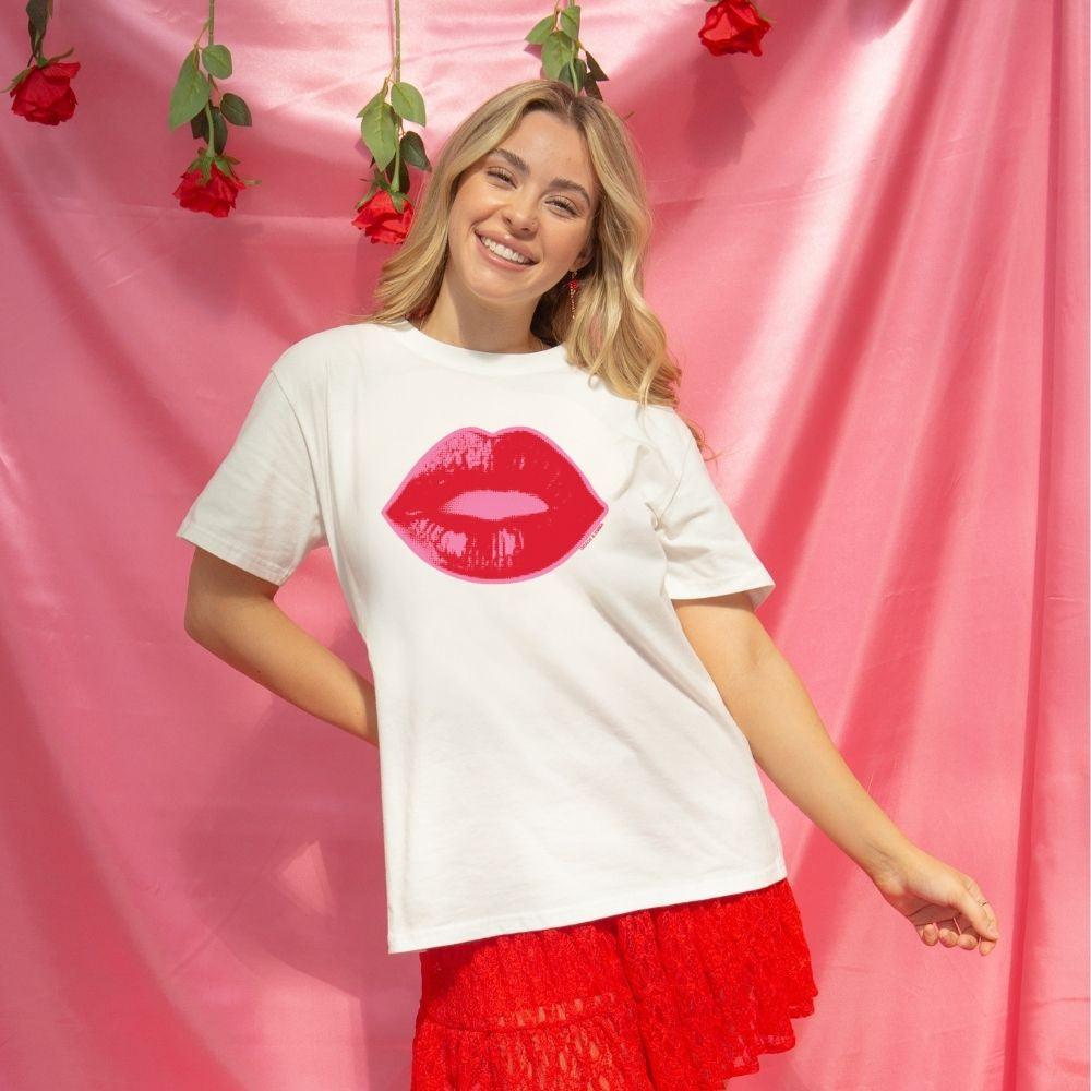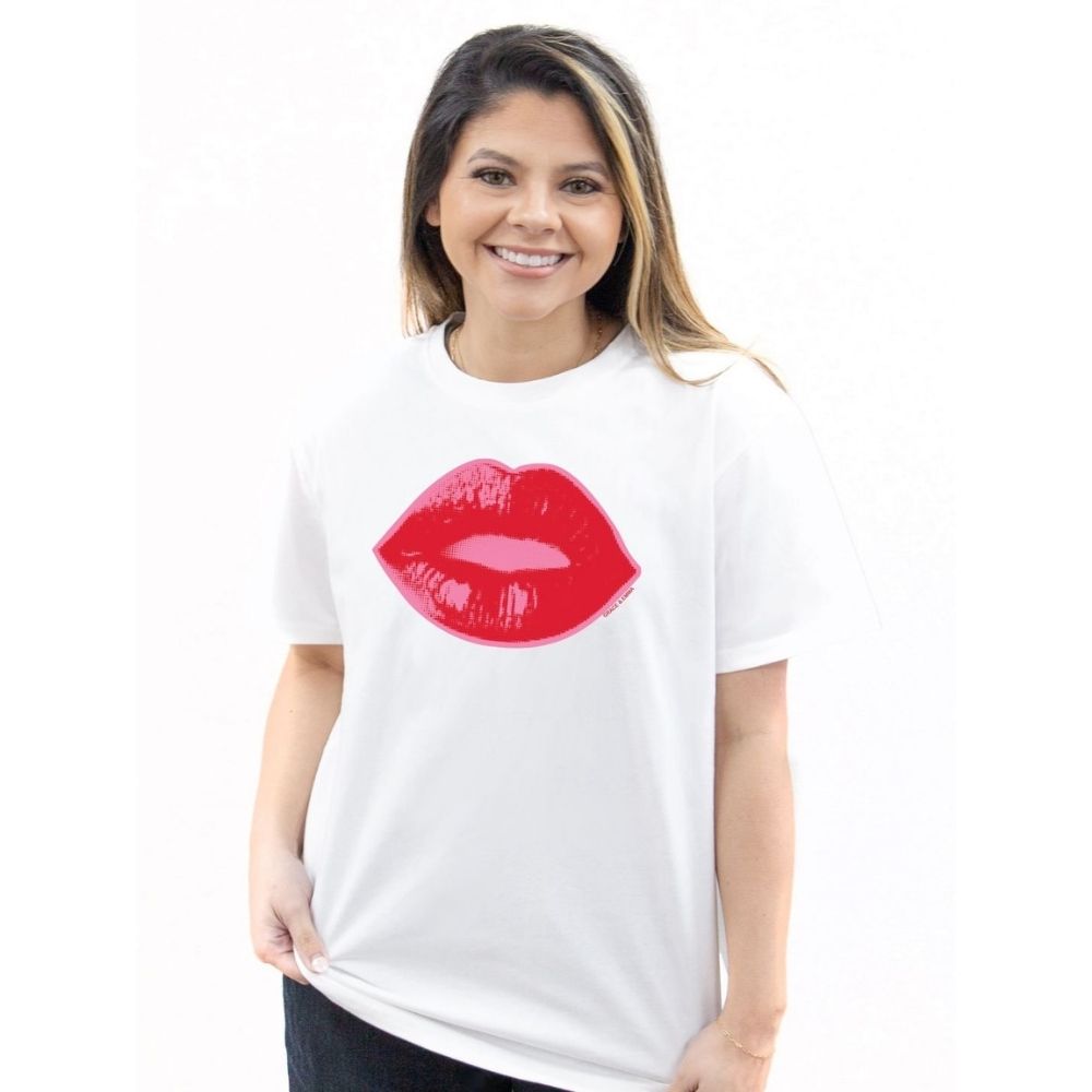 This white graphic tee makes a bold statement with its striking red lip graphic that instantly adds attitude and fun to any look. Designed with a relaxed, everyday fit, it’s easy to style while still standing out as a conversation piece.