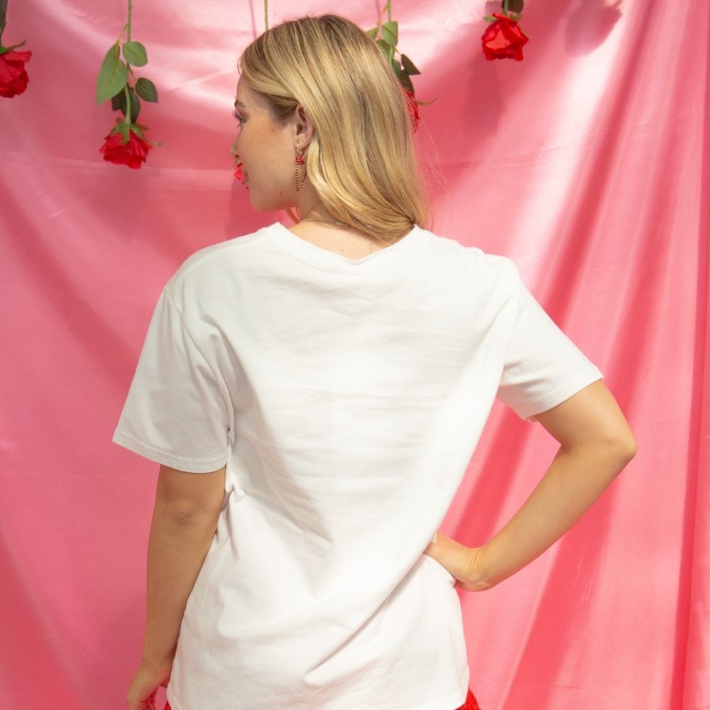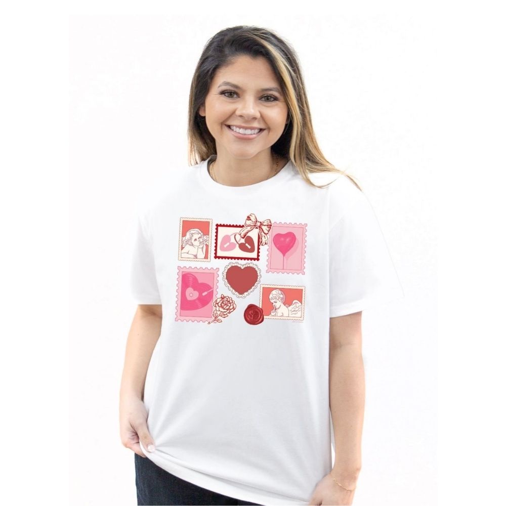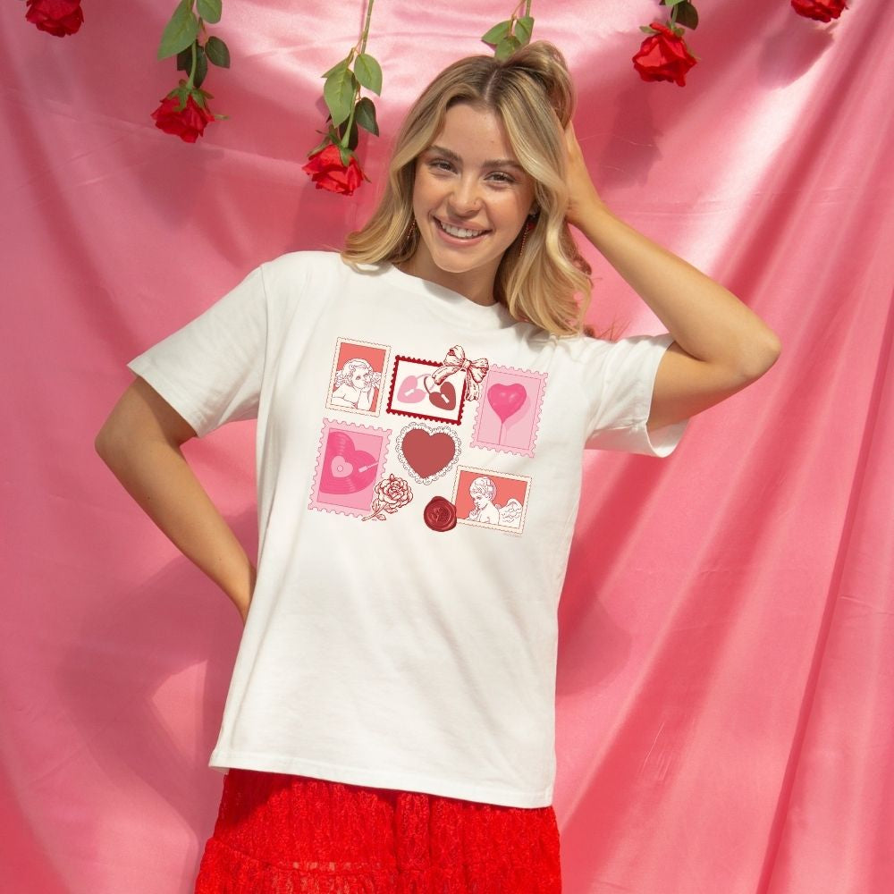 This classic white graphic tee features a charming Valentine-inspired collage of hearts and vintage stamp-style artwork that gives it a playful yet timeless feel. Easy to style and endlessly wearable, it adds personality to any casual look while still feeling soft, relaxed, and effortless.