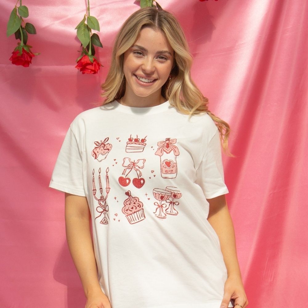 This white graphic tee with glitter print features a playful Valentine-inspired lineup of sweet treats and charming icons that instantly adds personality to any look. Designed with an easy, relaxed fit, it’s comfortable enough for everyday wear while still feeling fun and festive. It’s a standout top that effortlessly pairs with denim, trousers, or skirts for a cute, laid-back look with a seasonal twist.
