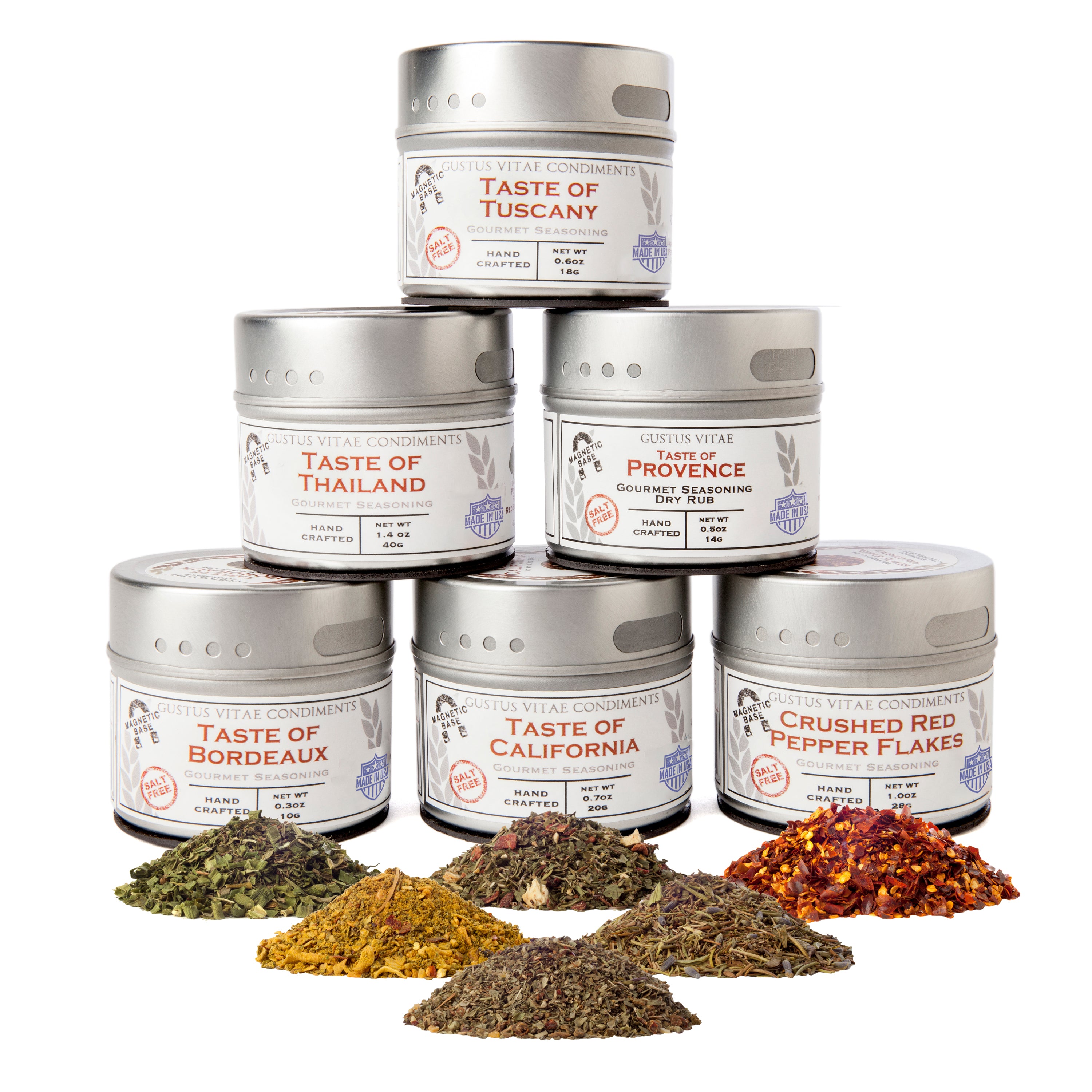 Each and every gourmet salt-free seasoning and spice blend is exceptional in it's own way: the sweet and zesty notes of Taste of California add delicious complexity to everything from meats to salad dressings; the fresh, savory Taste of Provence will bring the flavors of the French countryside to your kitchen; the light, warm notes of the Taste of Bordeaux lend refinement and depth to dishes ranging from roasted potatoes to poached eggs; Taste of Thailand’s complex curry and bold flavors provide wonderful lift for veggies and chicken; the Crushed Red Pepper flakes add heat and depth to wide array of foods-from pastas to salad or even chicken and marinades; and the fragrant Taste of Tuscany's fresh, varied texture and bright aroma make it the ideal final accent to pastas, pestos, bruschetta and crostini.