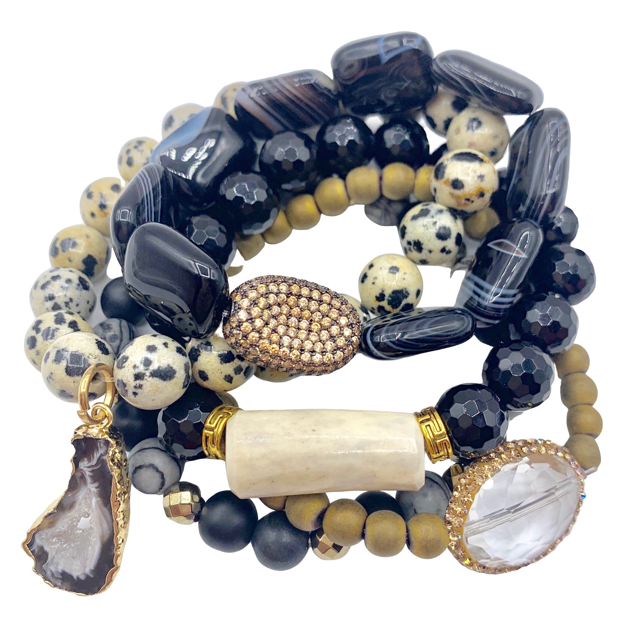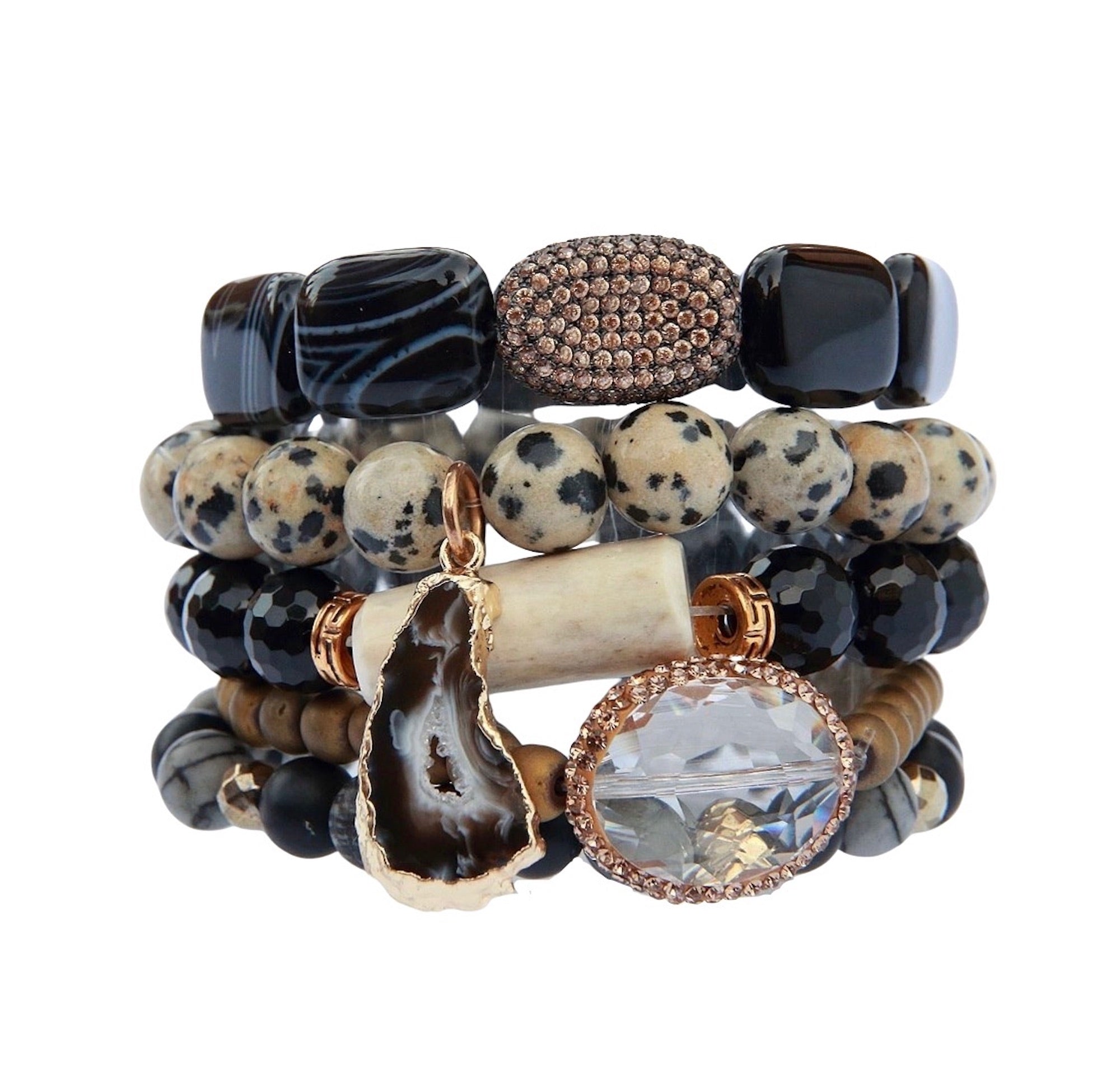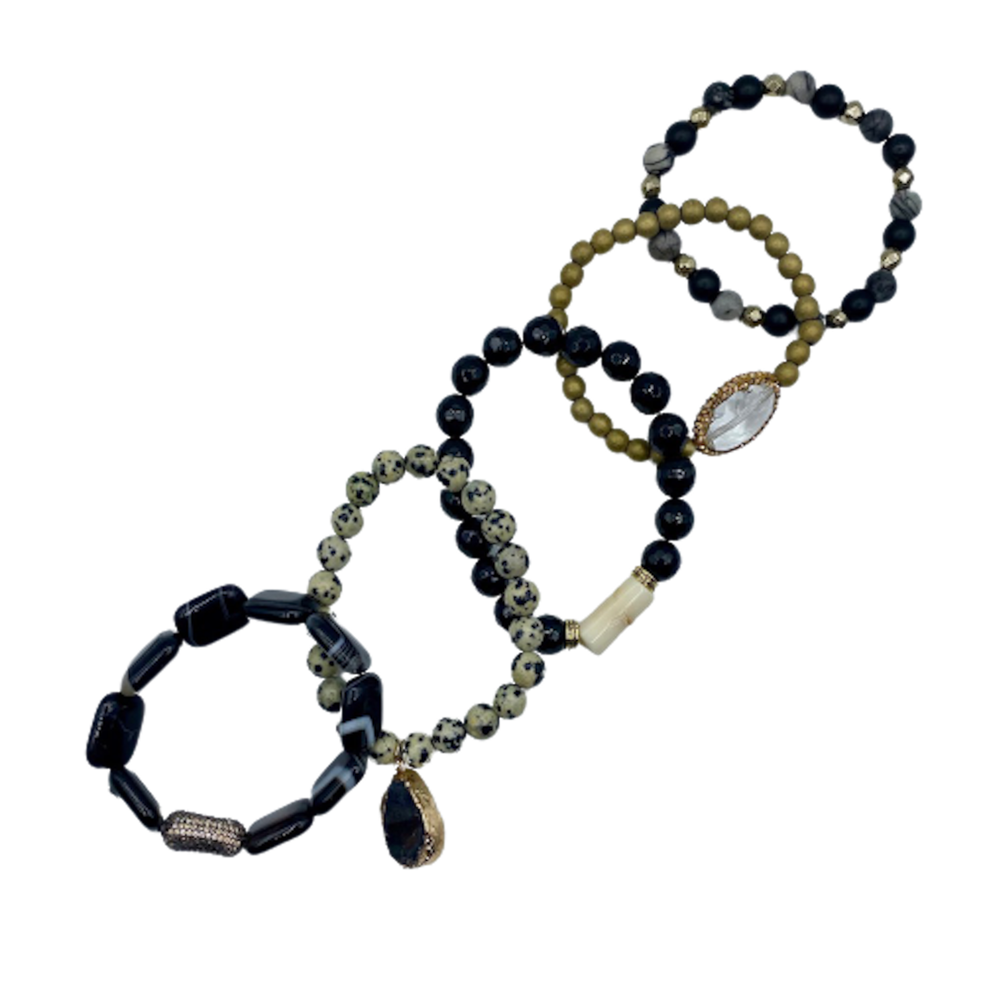 Transform your outfit from ordinary to extraordinary with a bold bracelet stack! Featuring a variety of textures and accents, these five bracelets are designed to look great together or on their own.