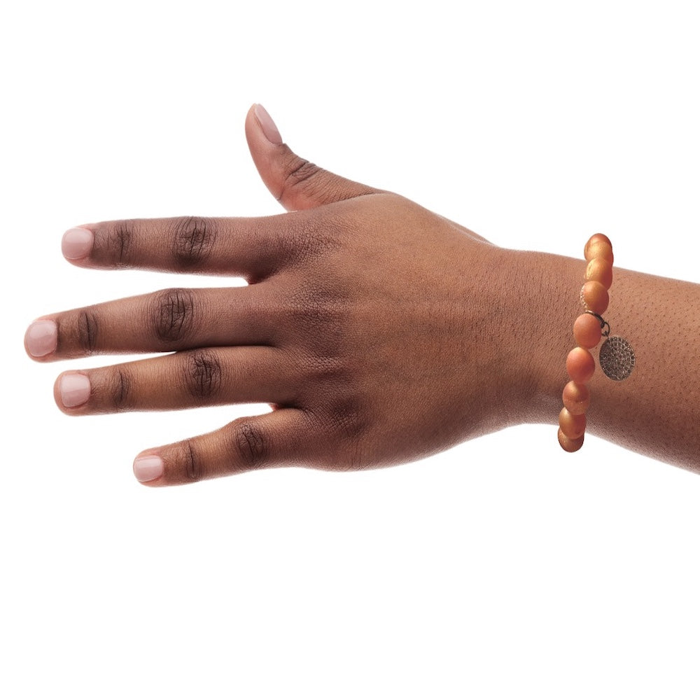 With pavé CZ stones and peach druzy beads, this bracelet makes a beautiful statement piece. Whether you wear it solo or stacked, it can effortlessly carry you from day to night.