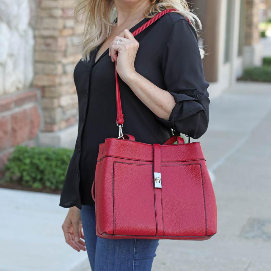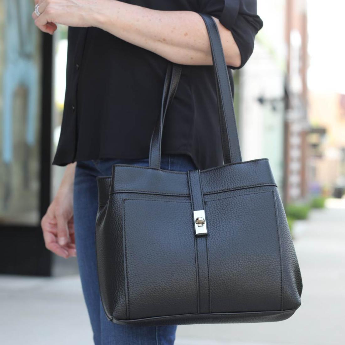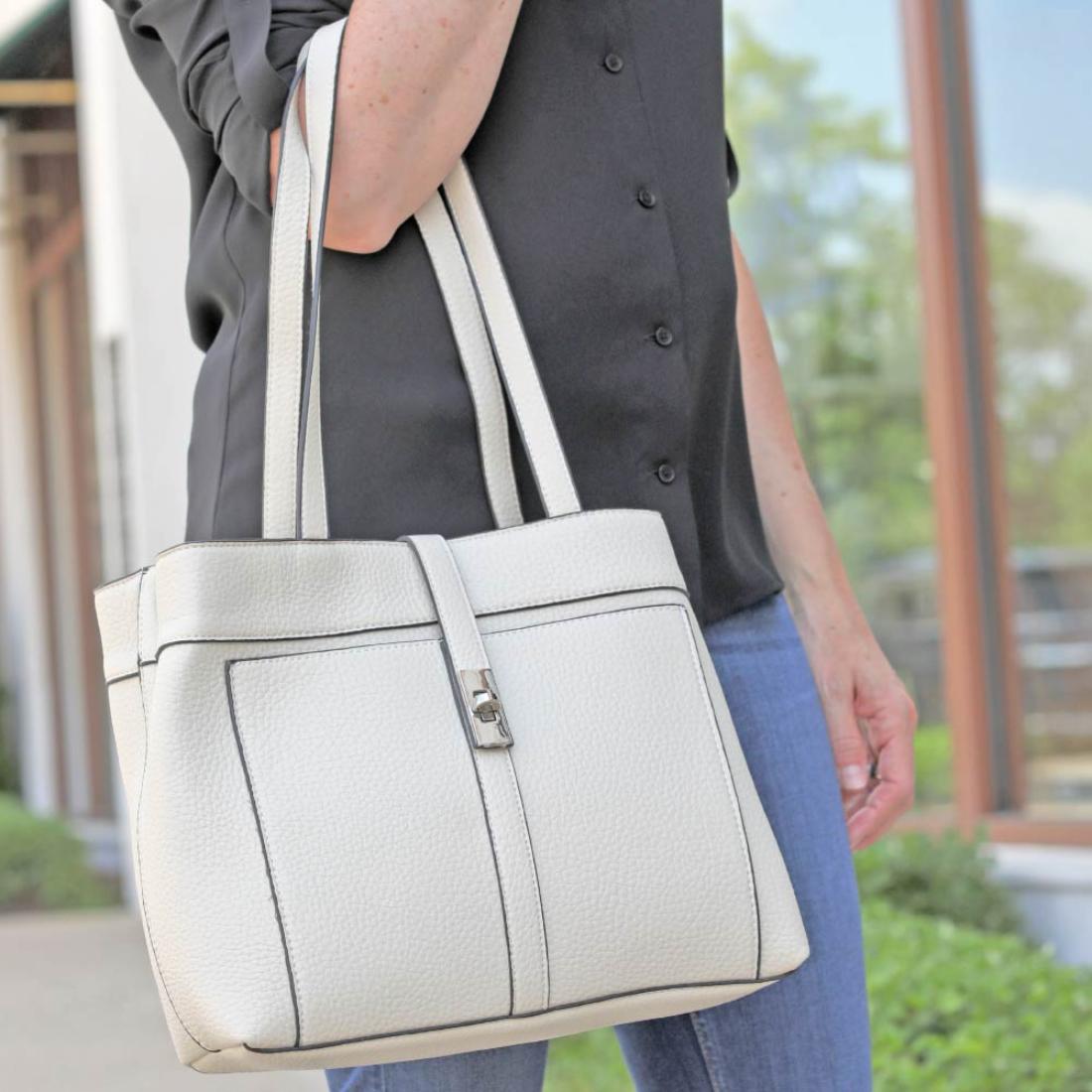 This classically designed tote comes with a crossbody strap for when you need to go hands-free. With a front open pocket for easy in and out, and decorative clasp for an elegant look, this bag is great for any occasion—from everyday wear to travel. Its three-tiered organization structure provides ample storage space.