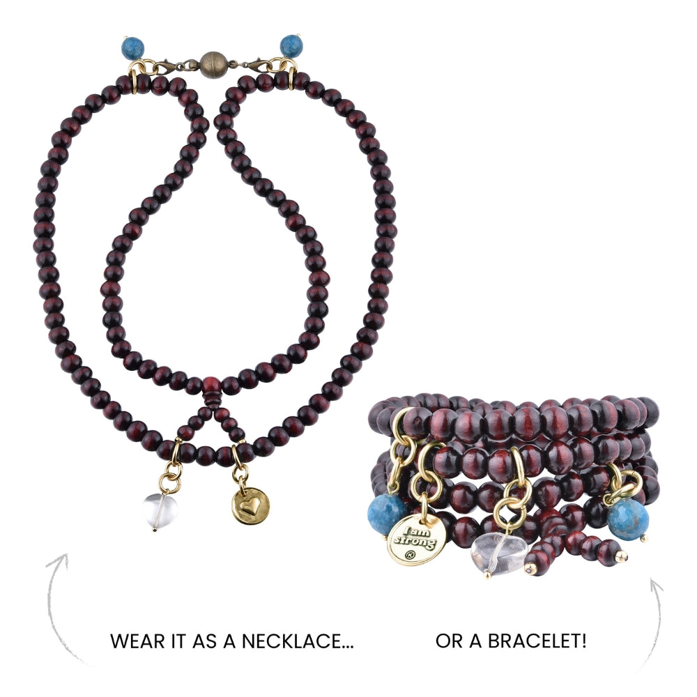 The I Am Strong Heart Wood Boho Wrap blends red wooden beads with a crystal quartz heart, apatite accents, and a gold finish pendant. The magnetic clasp allows you to wrap it as a necklace or bracelet, and carry strength with every wear.