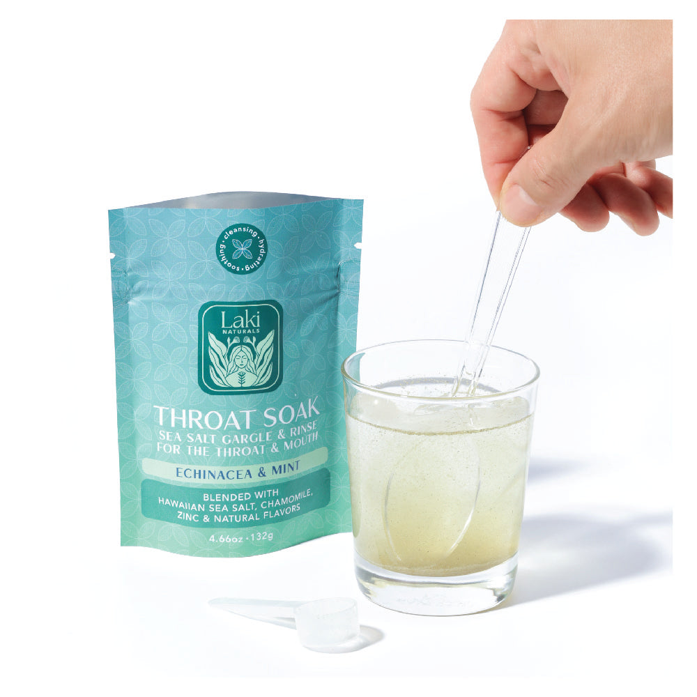 Salt water gargles are a popular alternative remedy for many non-serious throat and mouth discomforts. Inspired by an ancient Hawaiian remedy, this Throat Soak is made with hydrating Hawaiian sea salts, chamomile, zinc, echinacea, and peppermint and helps soothe and calm sore, dry, or scratchy throats.