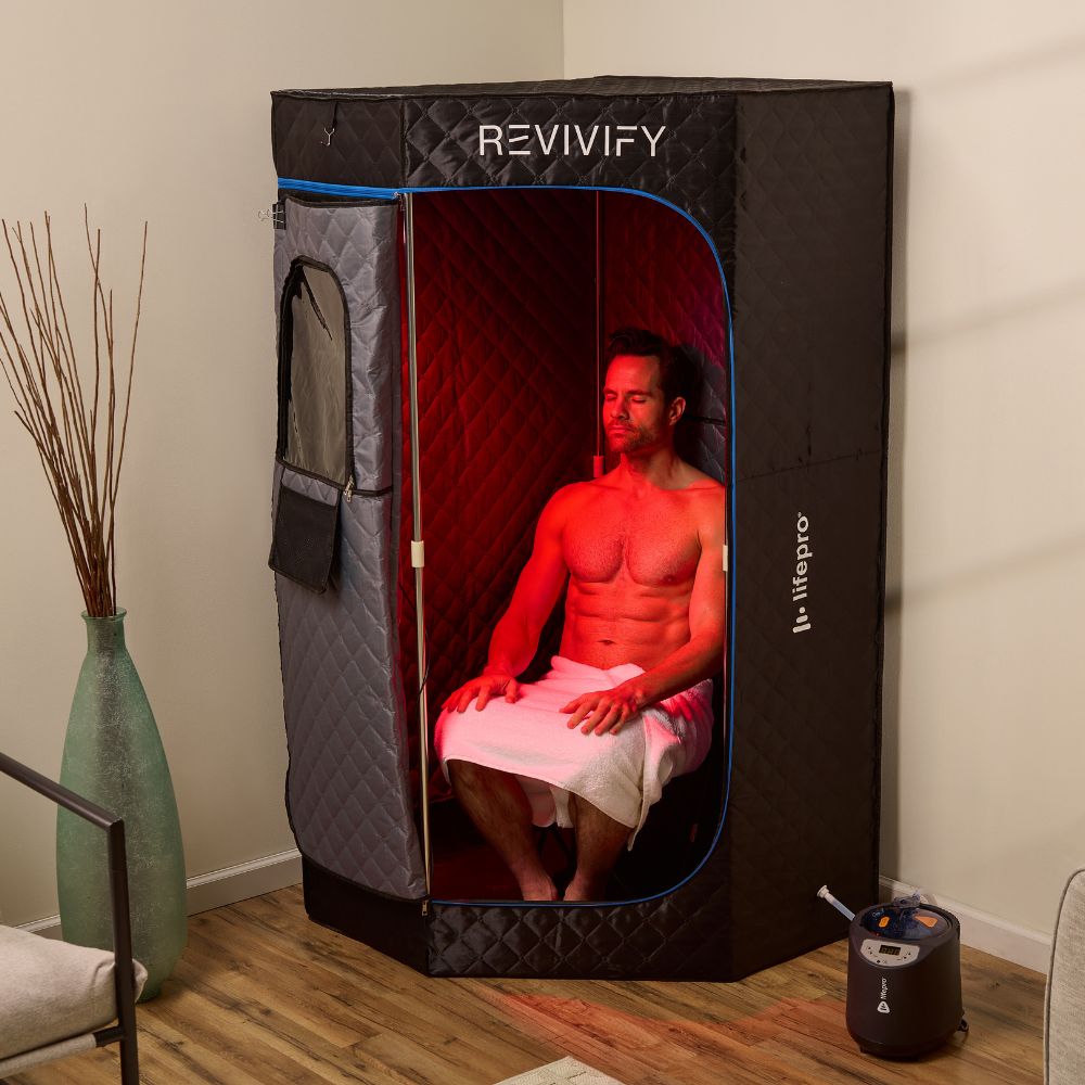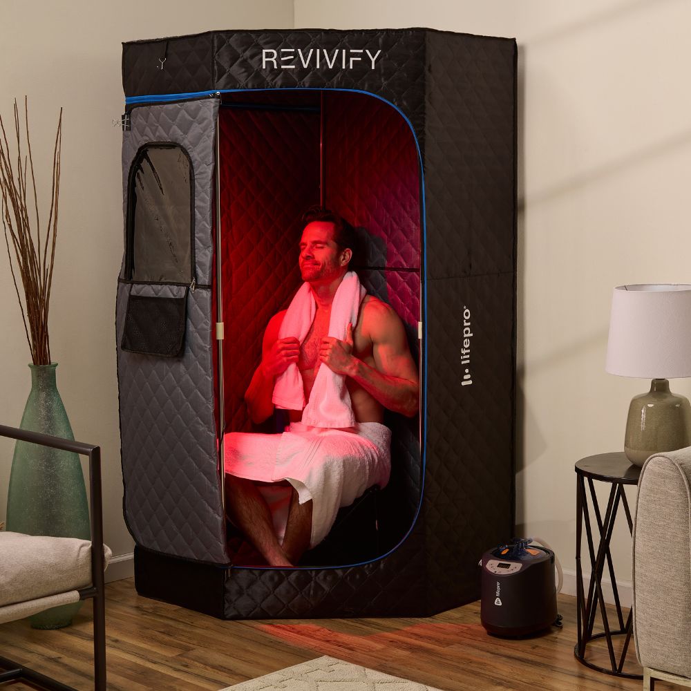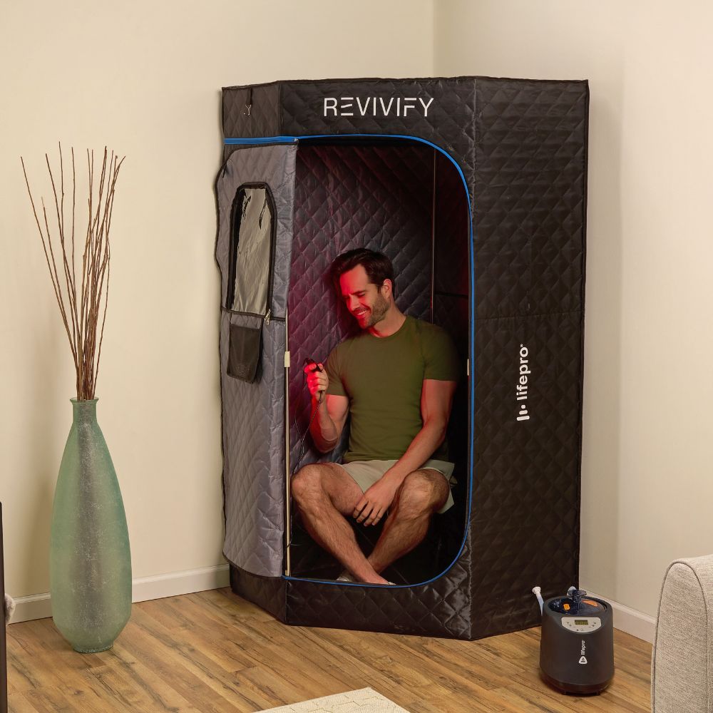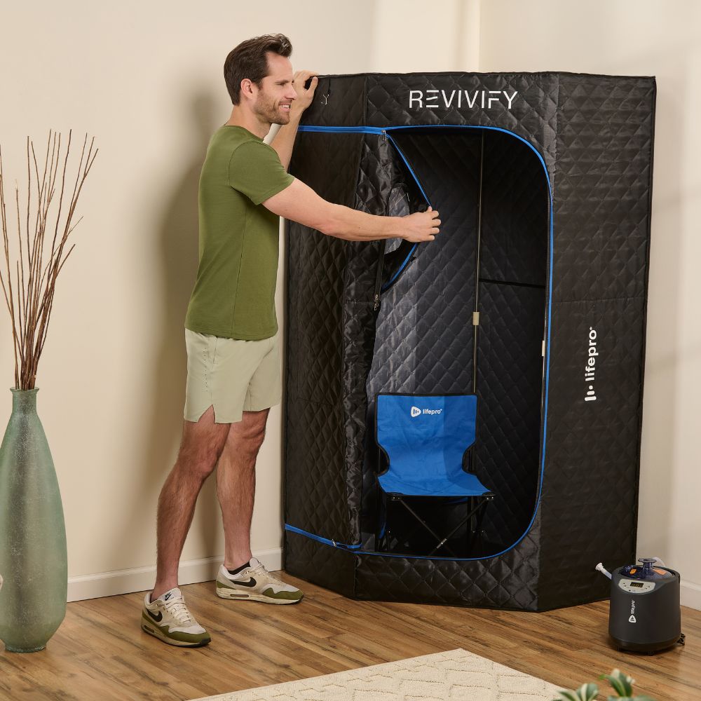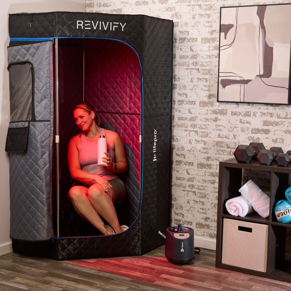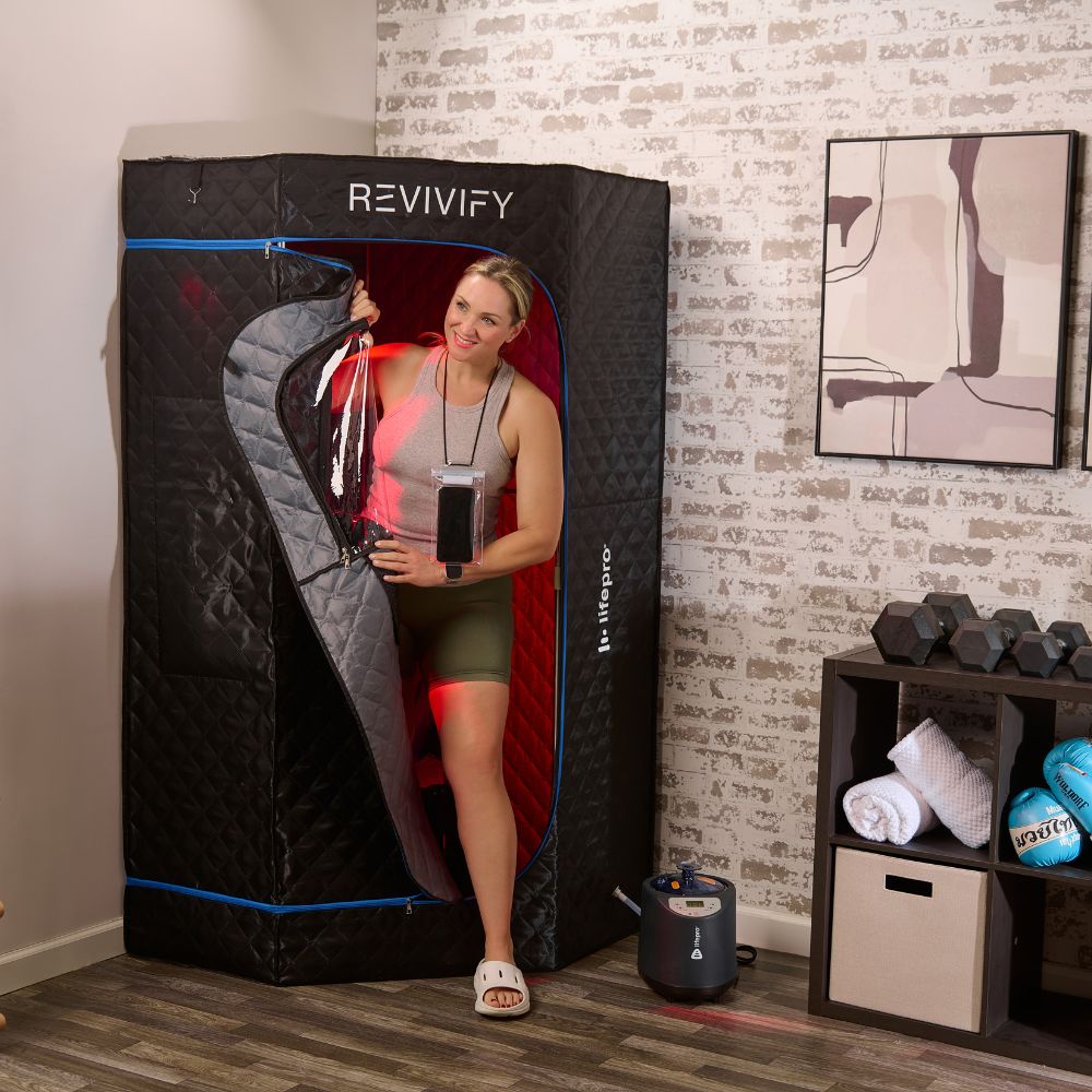 The Revivify Deluxe Portable Steam Room lets you enjoy powerful heat (steam) therapy and optional red light therapy in the comfort of your own home—no spa or gym required. This full-body steam room raises your internal body temperature, promoting a deep, detoxifying sweat that helps your body flush out toxins while supporting circulation, metabolism, and recovery.