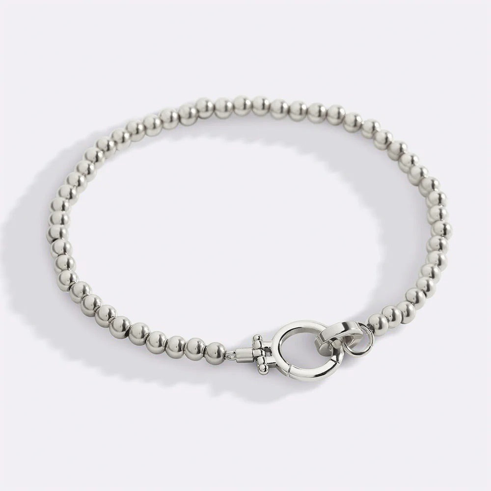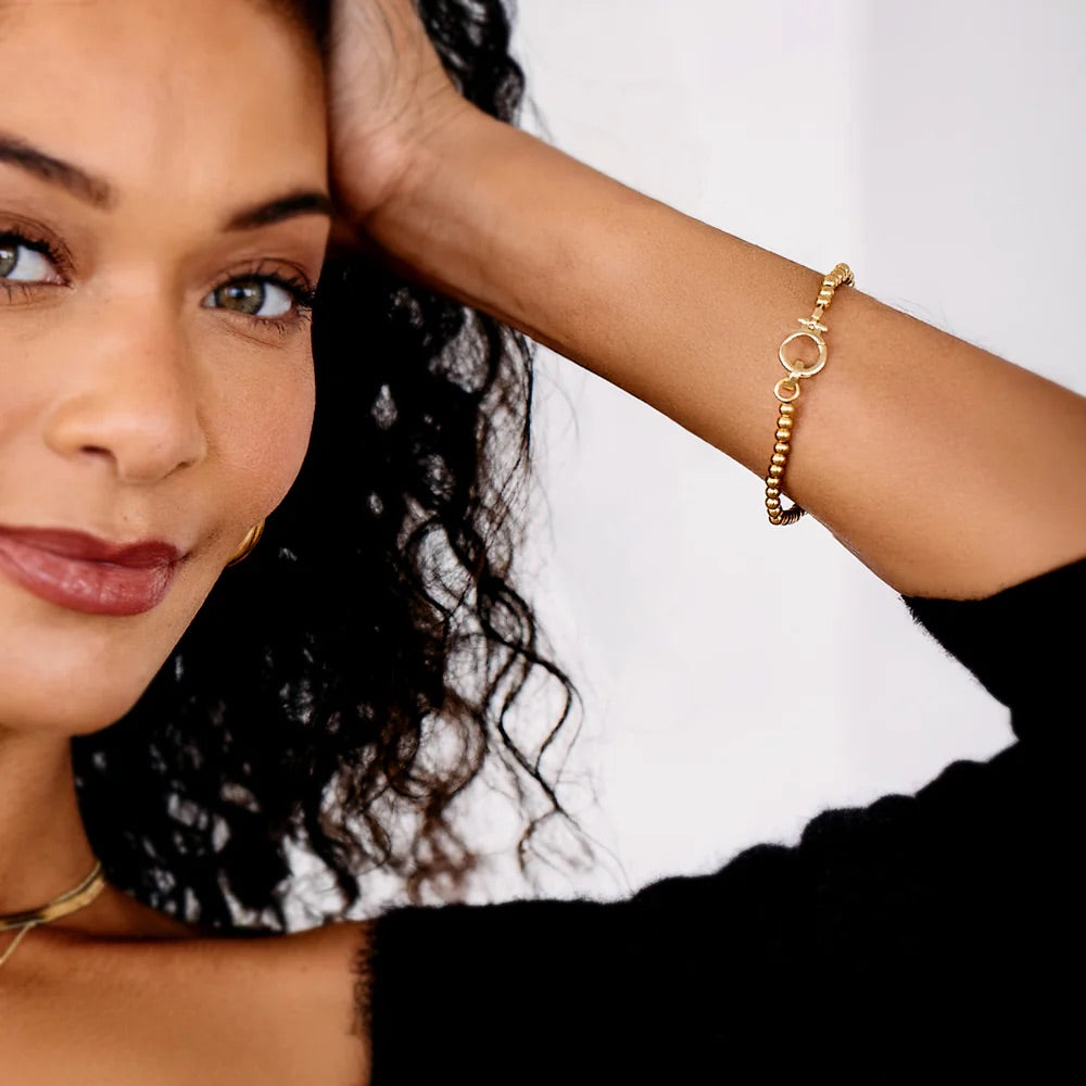 Delicate gold beads meet a mint charm clasp for a playful twist. Style it solo or personalize it with charms (sold separately). Effortless, versatile, and ideal for stacking—your bracelet, your way.