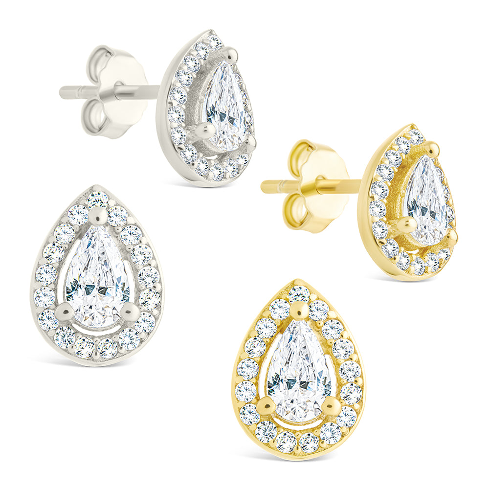 These brilliant earrings are a mix of elegance and edge. Made with Hearts & Arrows CZs, the pear-shaped center stone is surrounded by a delicate CZ halo. Simple enough for every day, but stunning enough to still make a statement.