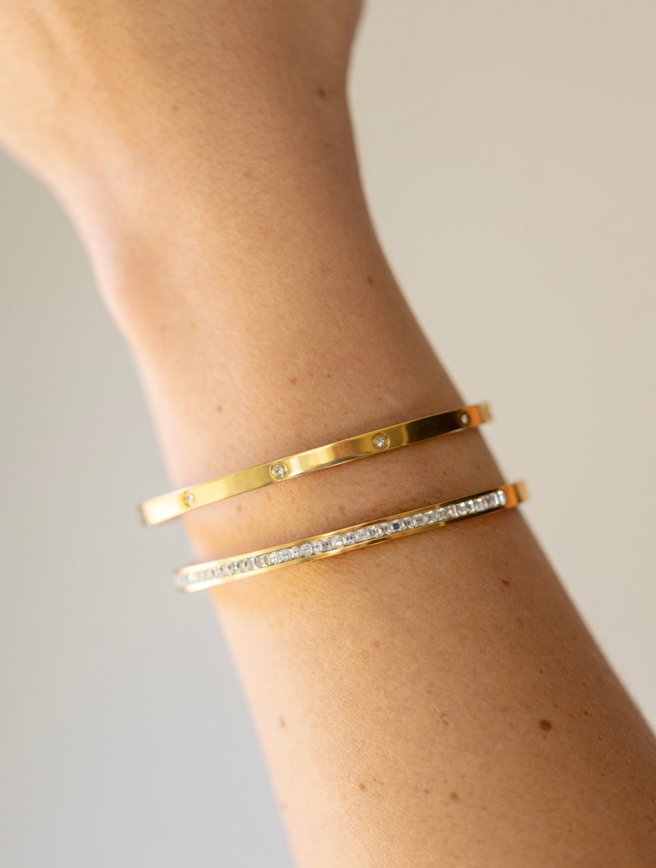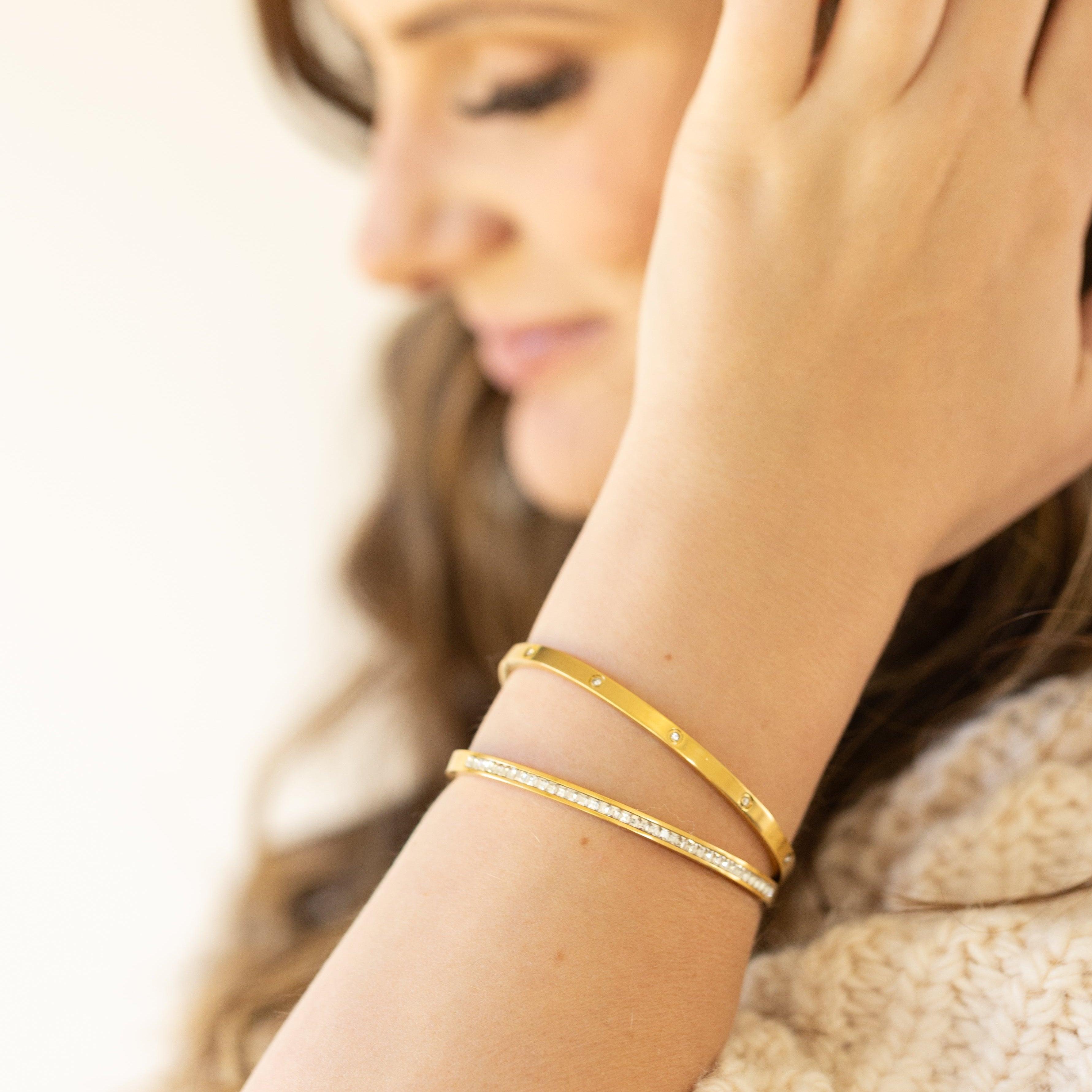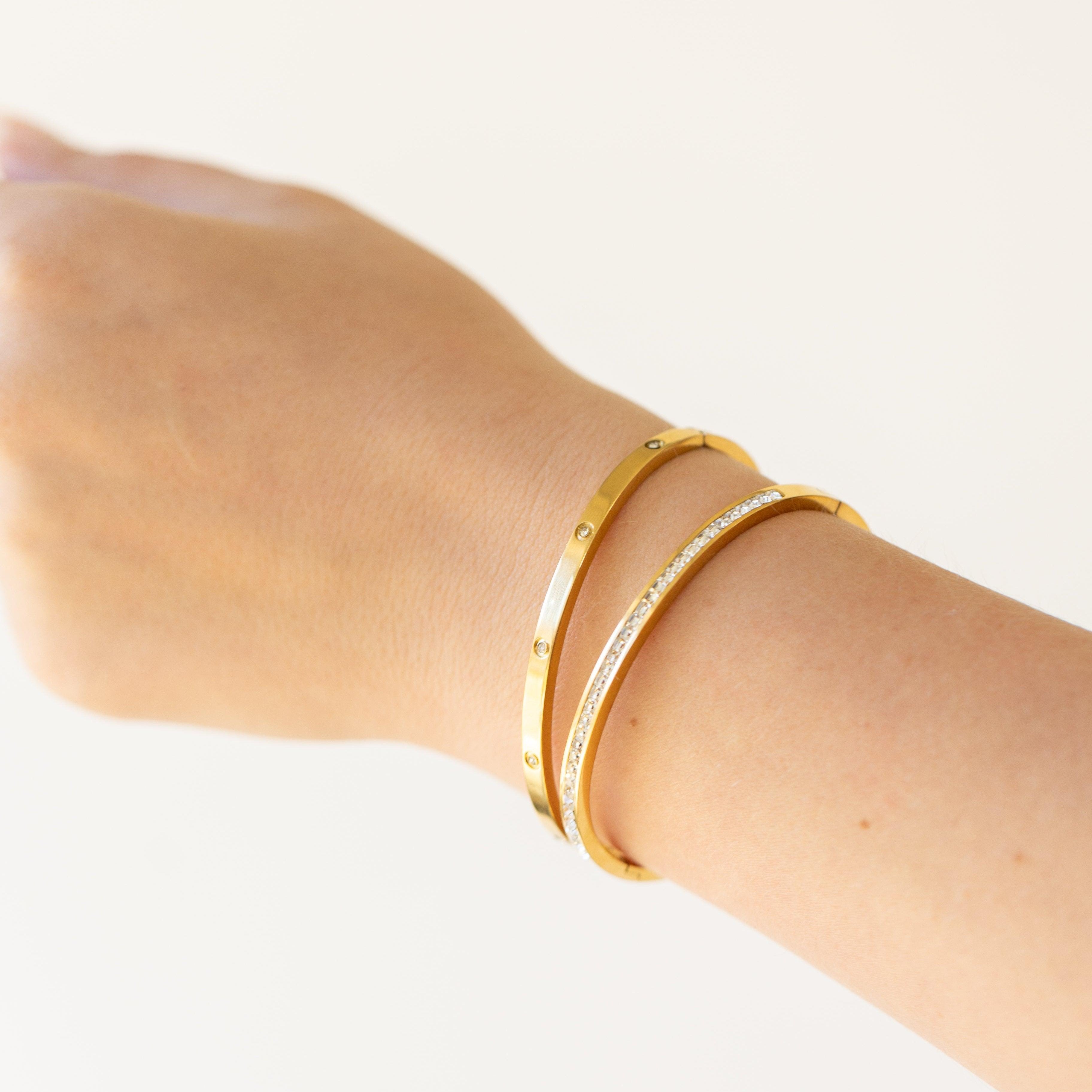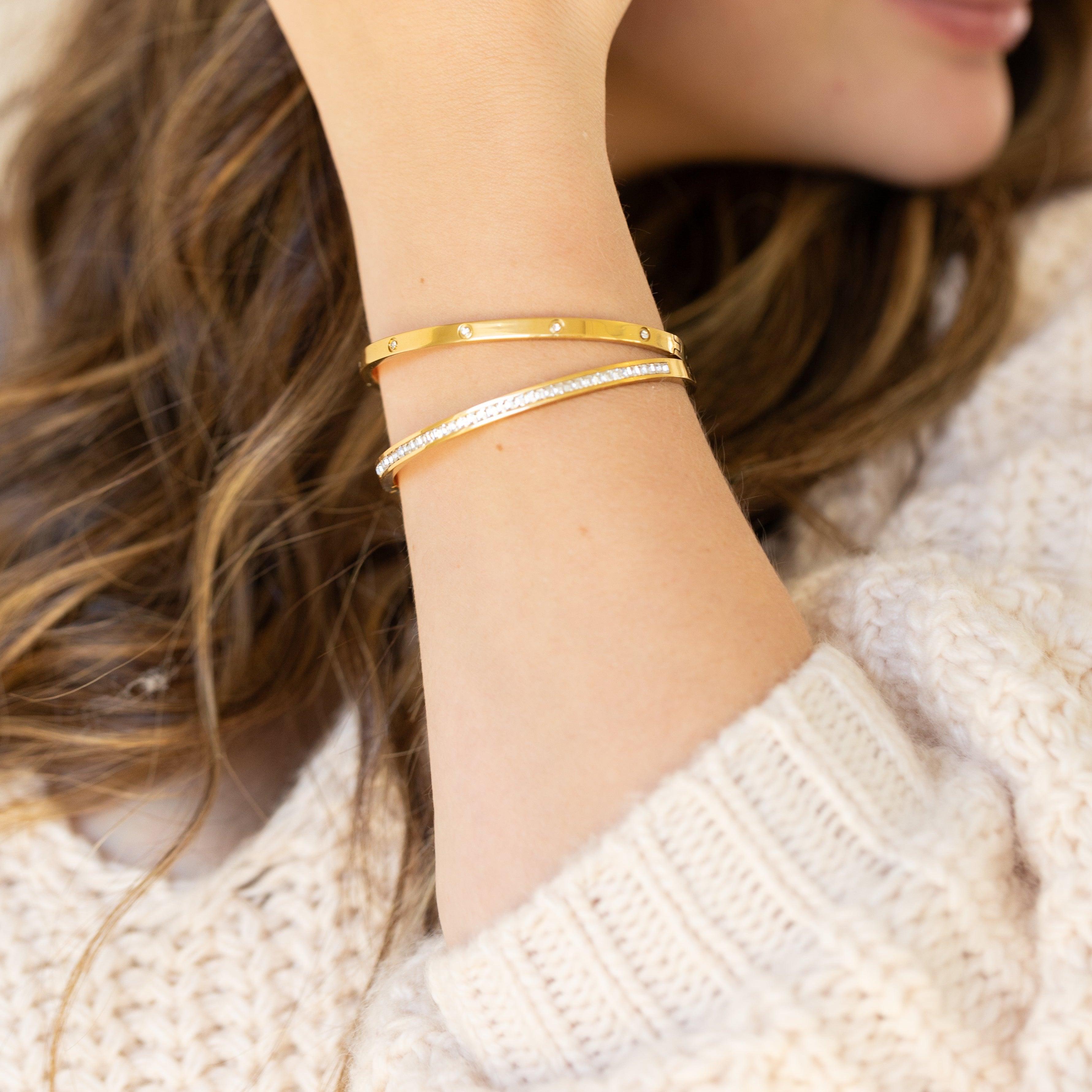 • Rhinestone bracelets: To open, press clasp down until bracelet pops open, attach to wrist, place on wrist, and pop clasp into place