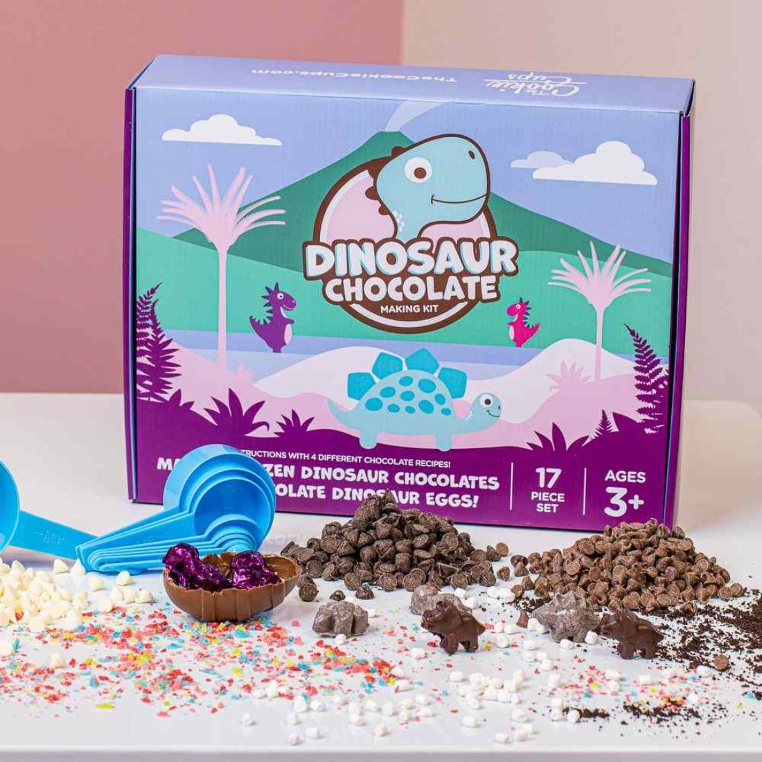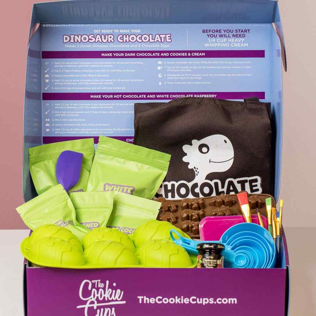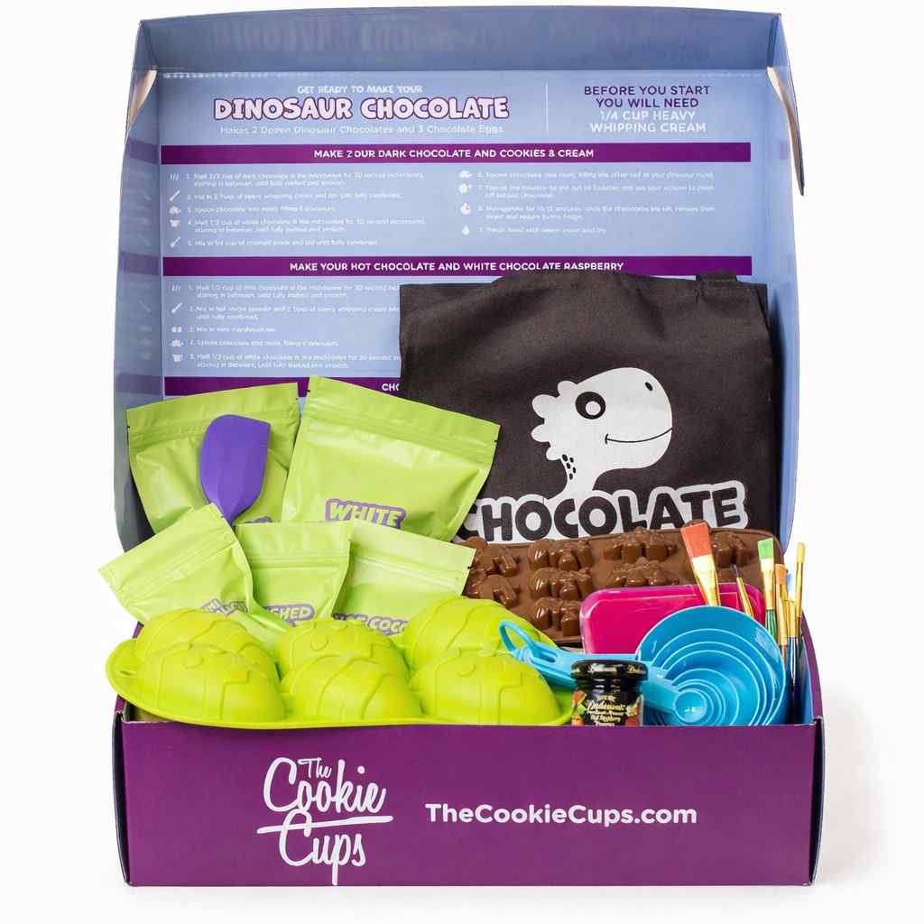 A full at-home baking experience for kids! This complete kit is designed for you to make two dozen dinosaur-shaped chocolates and three large chocolate dinosaur eggs from scratch. Get ready for a dino-mite time!