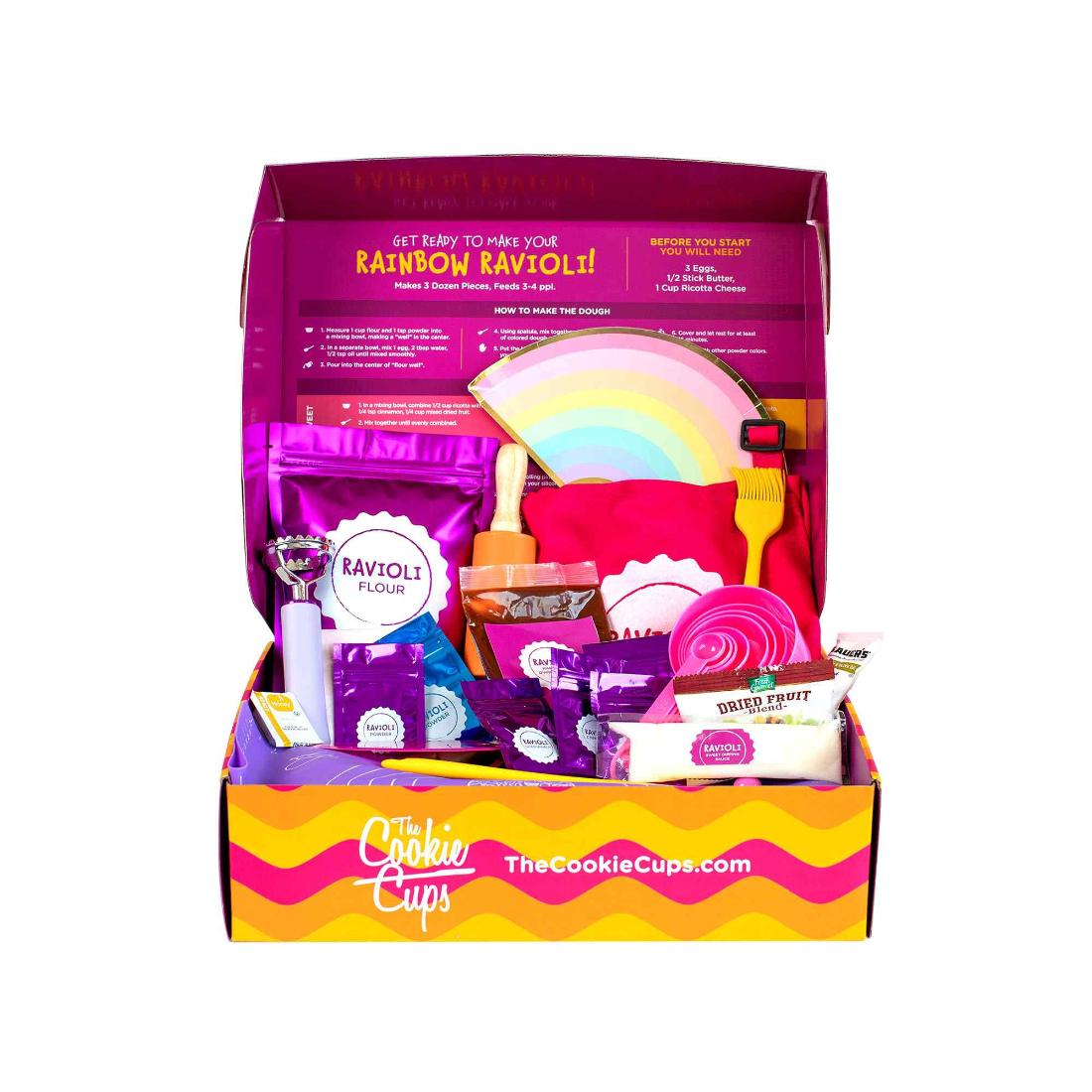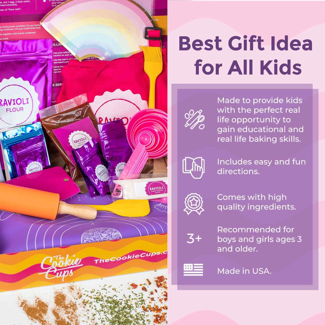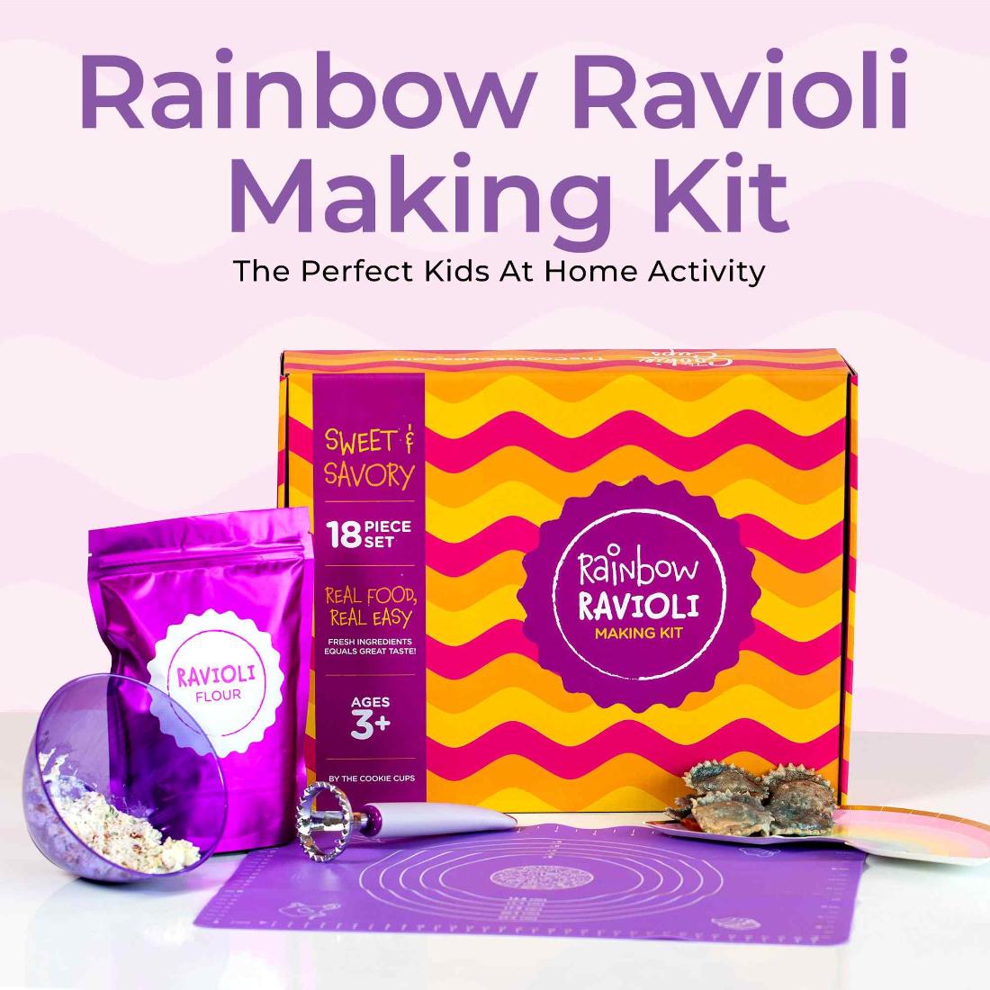 A full at-home cooking experience for kids! This complete kit is designed for you to make three dozen ravioli pieces from scratch. With both sweet and savory options, you’re sure to love these recipes.