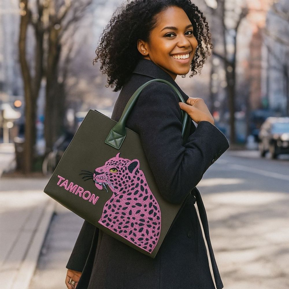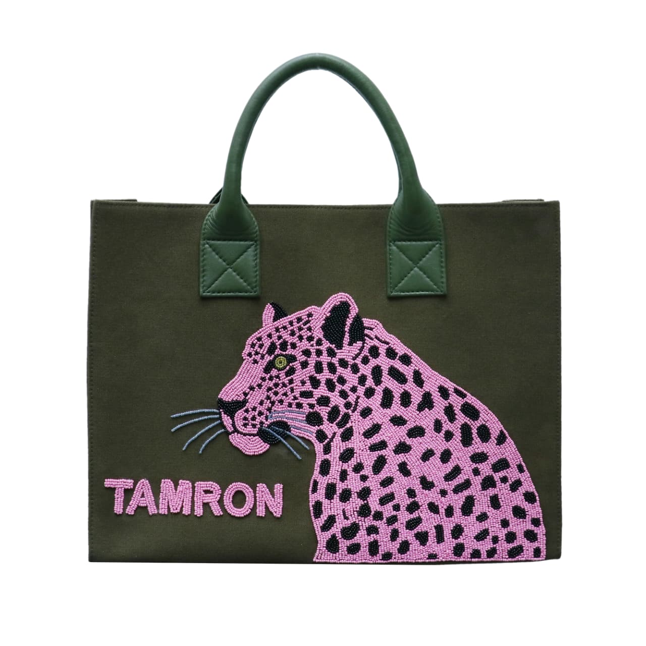 A made-to-order, hand-beaded canvas tote with a stylish cheetah design. This bag is fun and colorful, can be personalized, and is sure to be a head-turner!