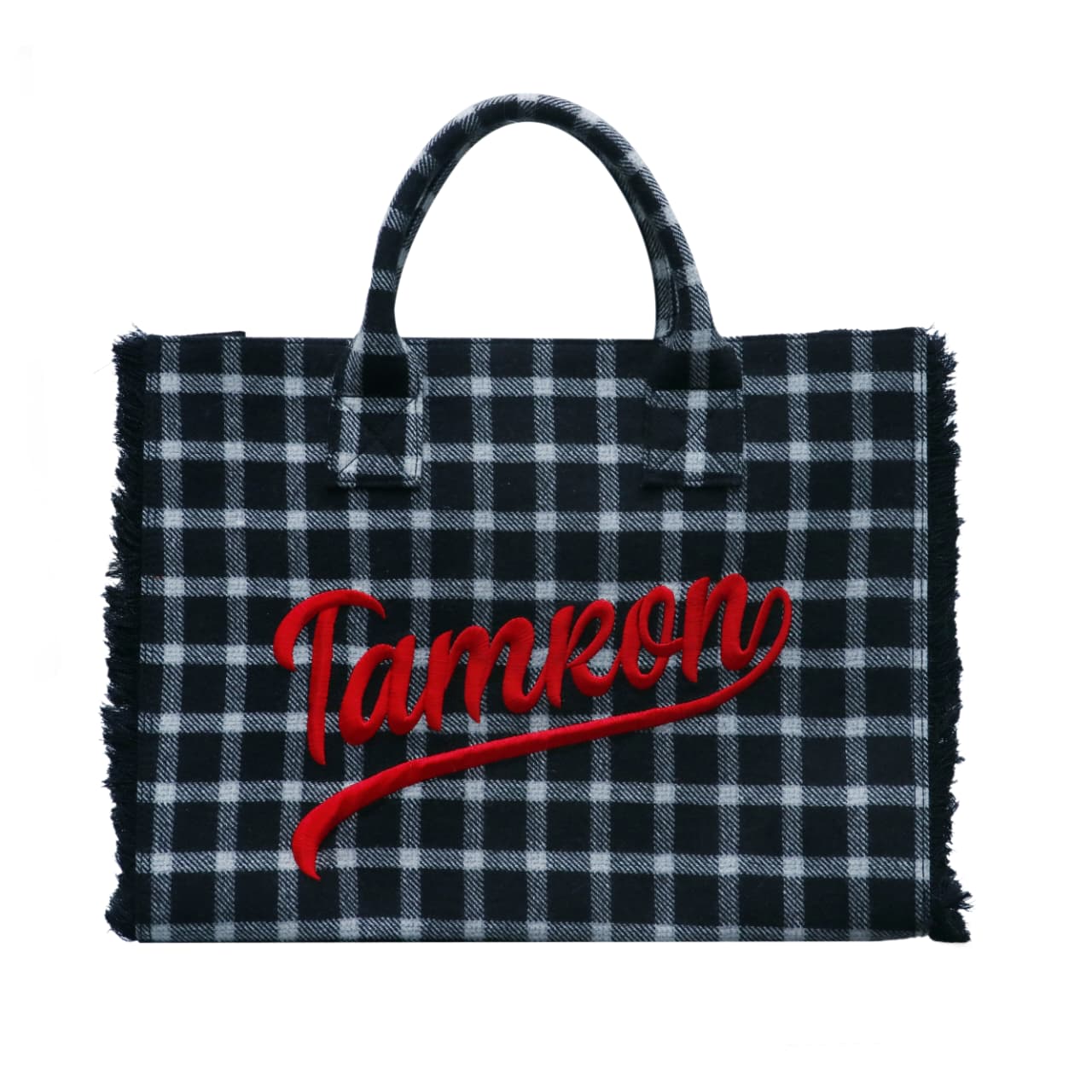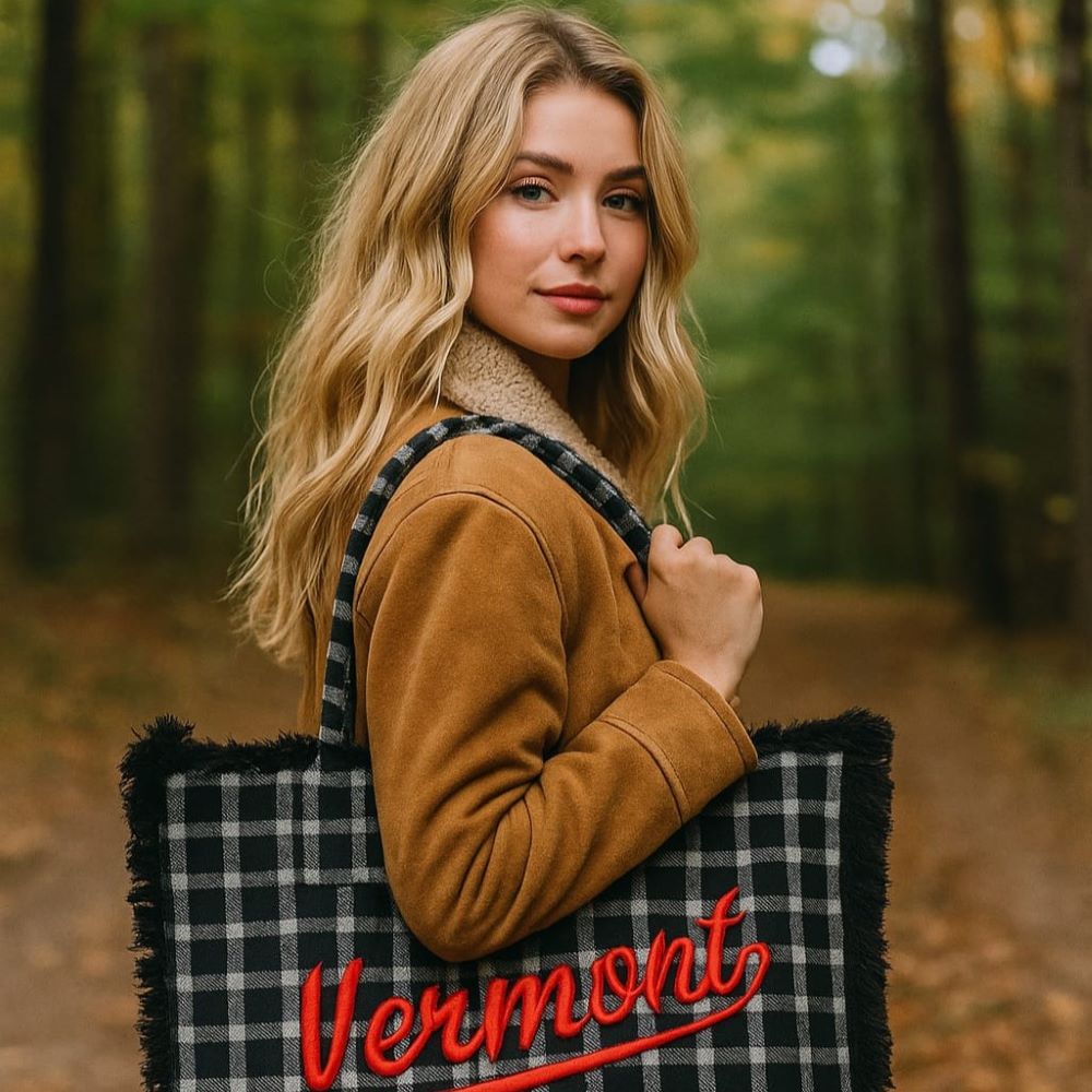 A made-to-order, hand-embroidered plaid tote. This bag is fun and cozy, can be personalized, and is sure to be a head-turner!