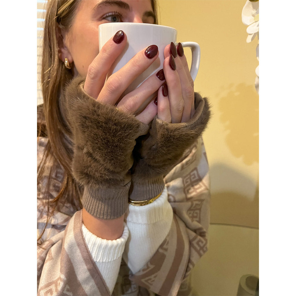 Stay cozy and stylish with the Blythe Gloves! These plush faux fur fingerless gloves are ideal for chilly mornings, keeping your hands warm while leaving your fingers free for texting, driving, or coffee runs. The ribbed cuffs add a touch of glamour and a snug fit, making them great for fall and winter. Available in chic colors to complement every outfit.