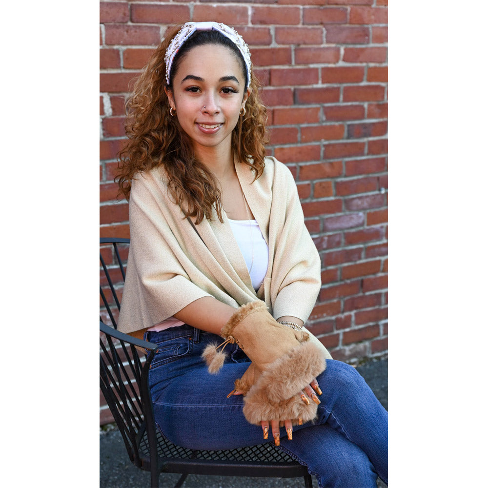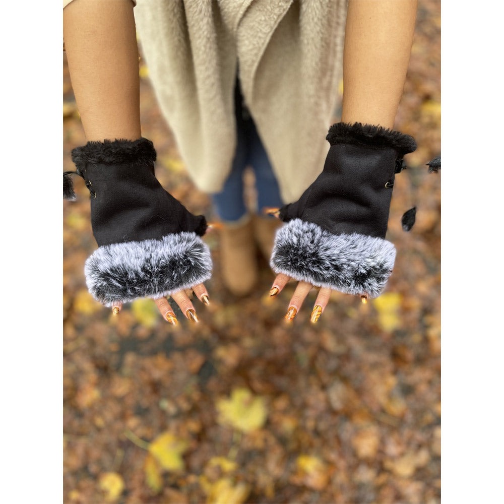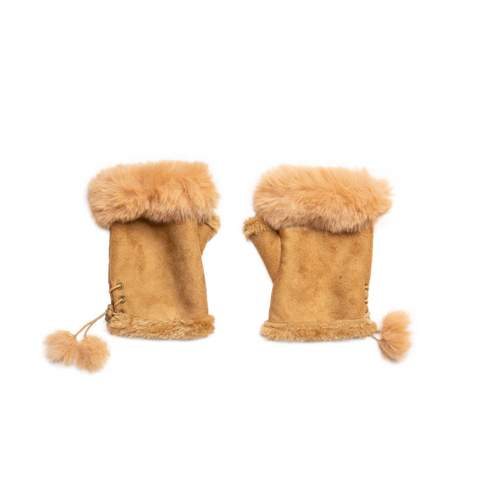 Stay stylish and warm all season long with these luxe faux suede fingerless gloves, trimmed in ultra-soft faux fur. Designed for cozy comfort and practical style, these gloves let your fingers stay free—ideal for texting, typing, or on-the-go errands. Featuring adjustable side laces for a custom fit and finished with playful faux fur pom-poms, these gloves add a charming touch to any cold-weather outfit.