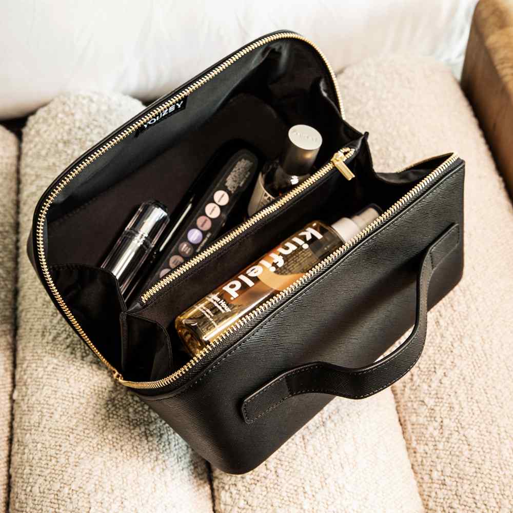 The Jetsetter Travel Cosmetic Case combines functionality with luxury, offering everything you need to stay organized and stylish on the go. Made from vegan leather, this bag blends beauty and versatility with a smart design that makes packing for any trip effortless. Whether you’re heading out for a weekend getaway or an extended adventure, travel confidently with a touch of sophistication at your fingertips.